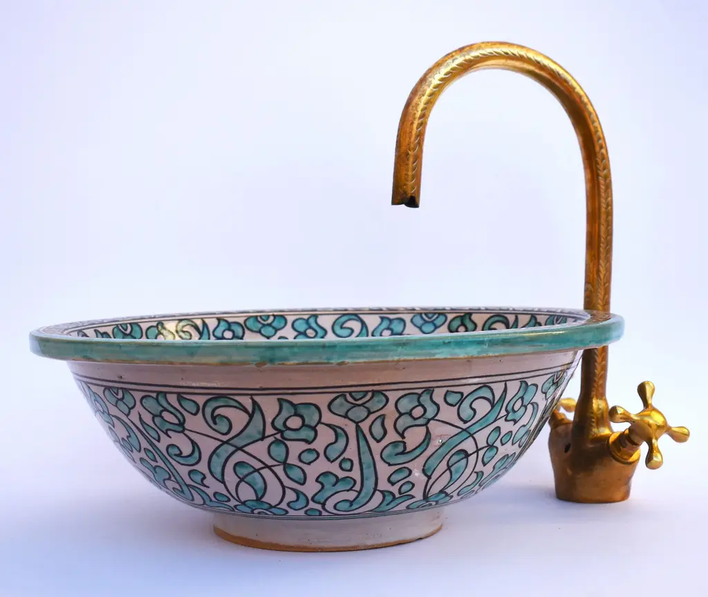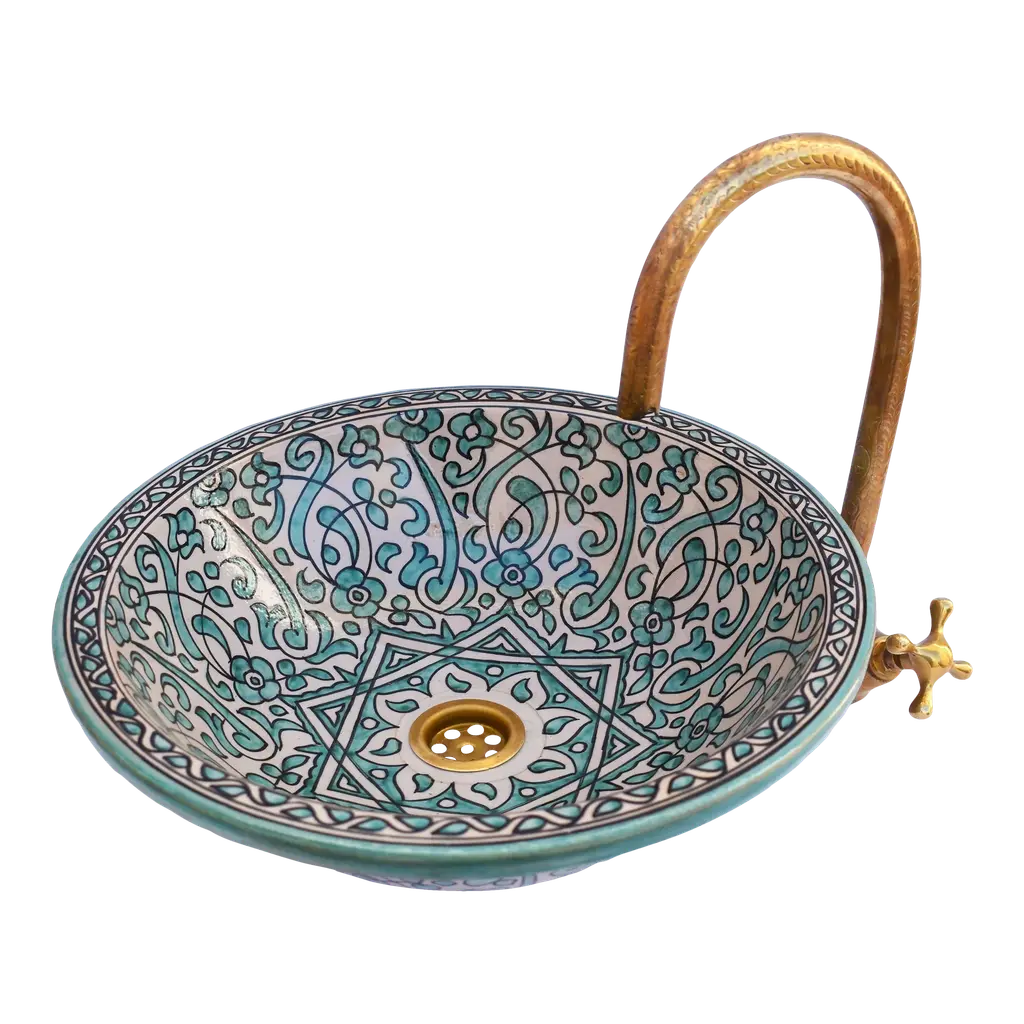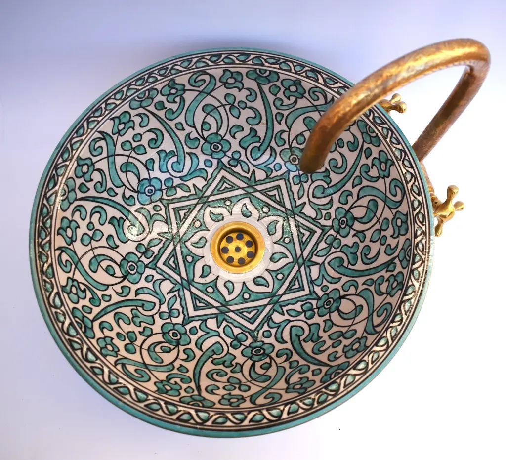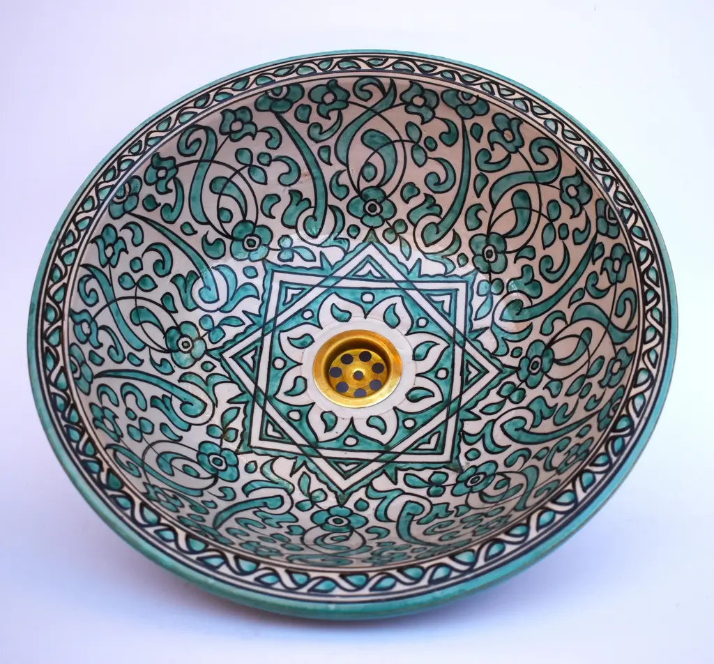 Introducing our exquisite Flower Ceramic Sink Bowl, a testament to the artistry of Moroccan craftsmanship. This drop-in vessel sink is meticulously handcrafted from premium ceramic, ensuring both durability and timeless elegance. The surface is adorned with a captivating Green Flowers pattern, featuring a stunning star motif at its center, creating a harmonious blend of nature-inspired aesthetics and Moroccan charm. Each Antique Ceramic Sink Bowl is a unique masterpiece, meticulously painted by our skilled artisans, showcasing their dedication to precision and craftsmanship. The vibrant green hues add a touch of freshness to any space, making it an ideal choice for those seeking a mini bathroom sink or lavatory washbasin with a distinctive appeal. The Flower Ceramic Sink Bowl comes complete with a complimentary brass drain, adding a artistry finishing touch to this functional work of art. Choose a Green Drop-in Vessel Sink that transcends the ordinary and transforms your bathroom into a sanctuary of style and sophistication. Immerse yourself in the beauty of handcrafted artistry with our Flower Ceramic Sink Bowl – an investment in quality, tradition, and unparalleled beauty. Please note that due to the handcrafted nature of this sink, there may be slight variations in color and pattern, making each piece truly unique.