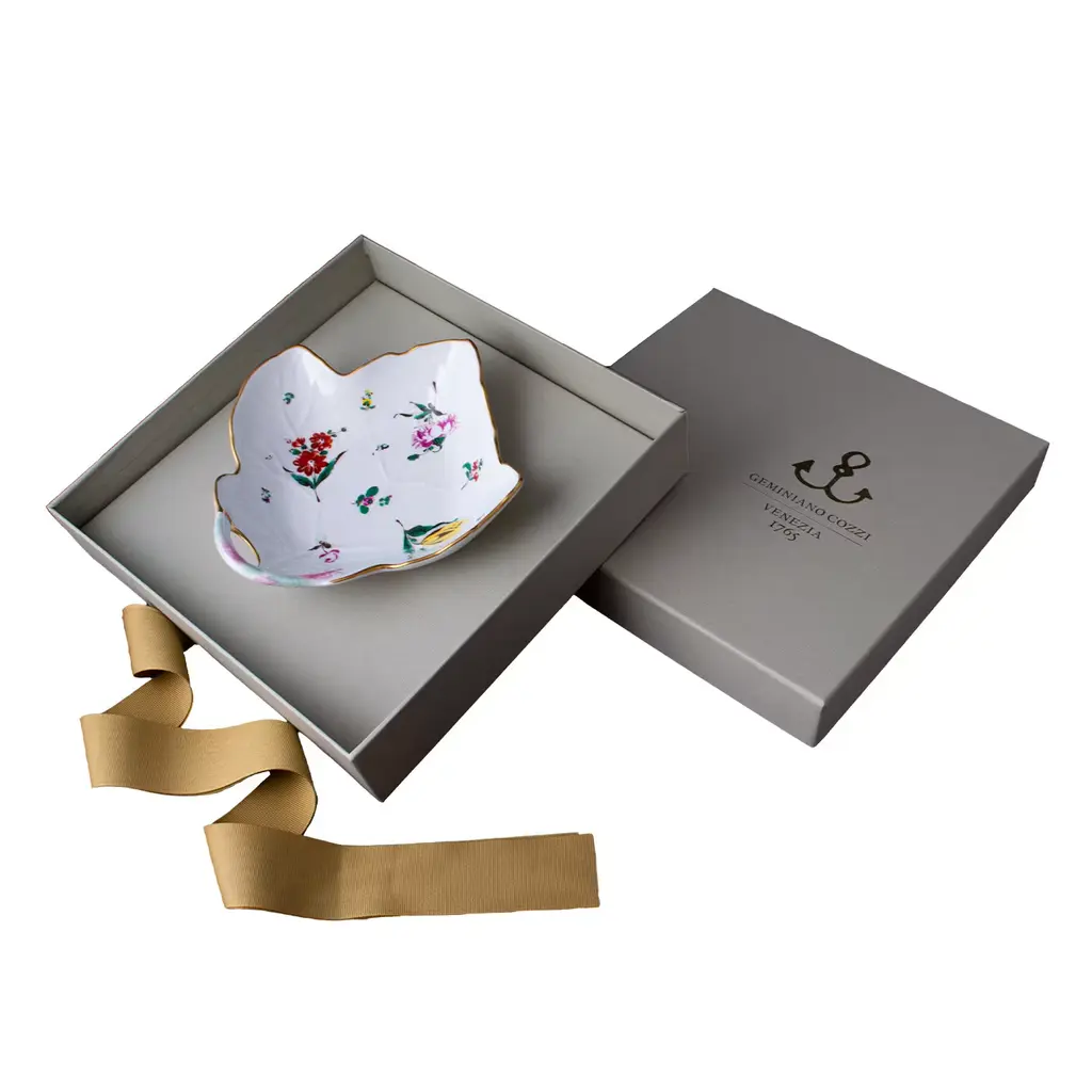This romantic bowl in fine porcelain borrows the harmonious and spontaneous silhouette of a leaf to achieve a concave design ideal for serving ice-cream or sorbet, an item used among the Venetian 18th century nobility. A gold rim traces the profile of the design, which boasts a motif of lively, multicolor flowers painted by hand standing out from the pure-white background featuring on-relief veins.