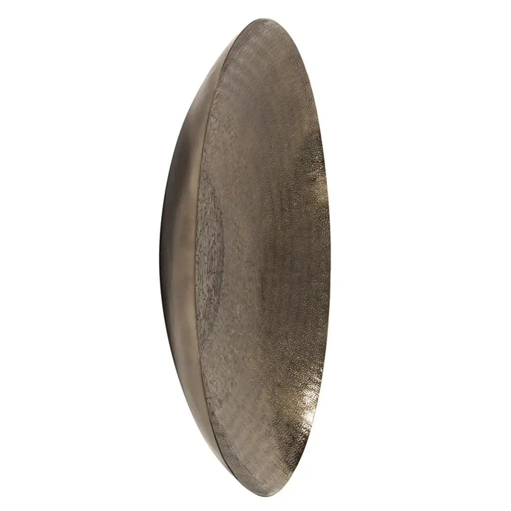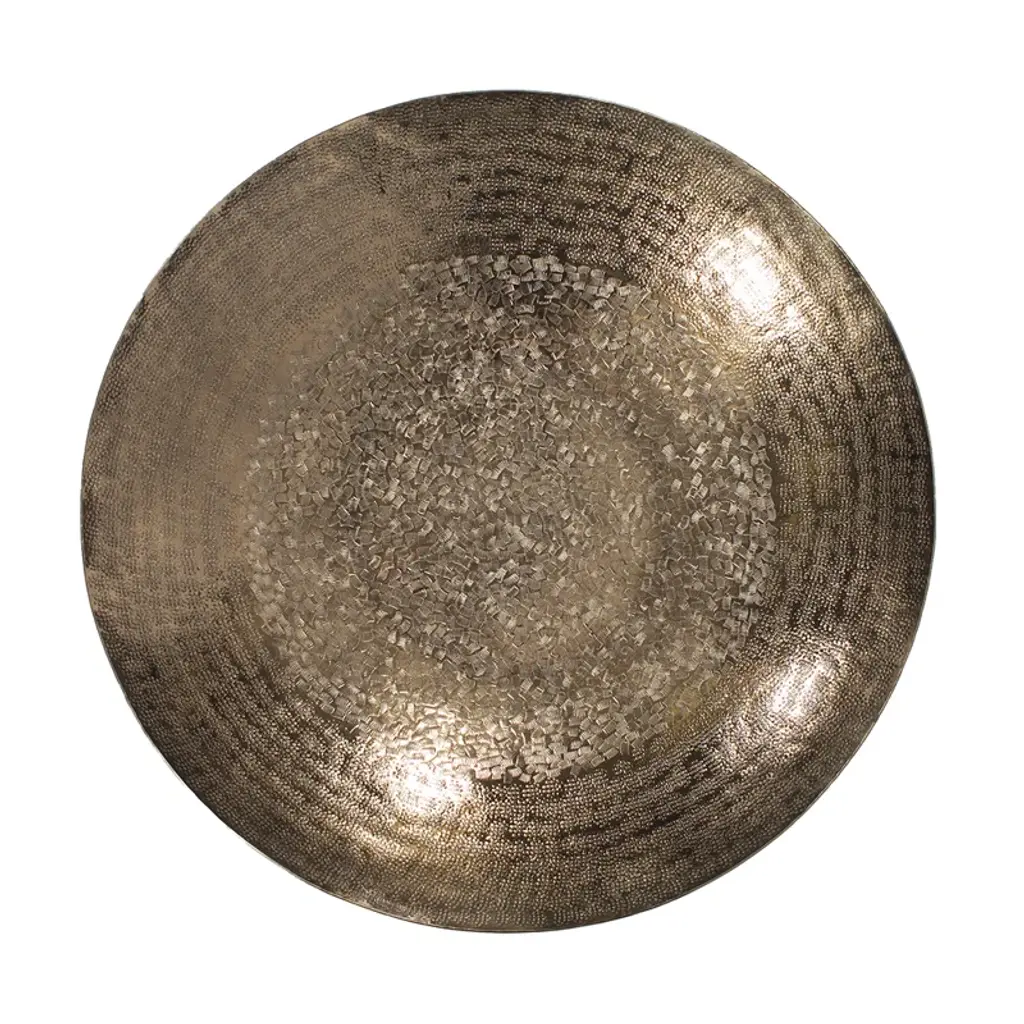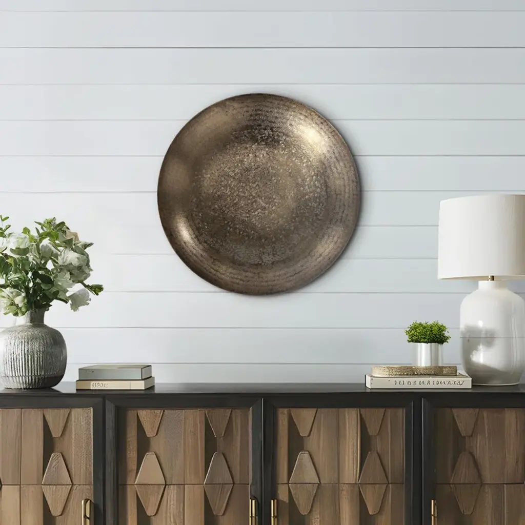 This aluminum decorative bowl offers a stylish way to enhance your decor with its round shape and intricate chiseled texture. Its metallic hue and shining finish add a luxe look, making it a standout piece on any surface. We love that it also comes with hanging hardware, allowing it to double as a sculptural wall art piece. Whether you place it on a console table or hang it on the wall, this bowl is a versatile addition to your home. Hand washing is recommended.