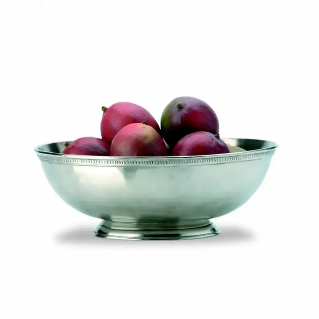 A charming, modestly scaled footed bowl featuring a delicate scallop design along the rim. Versatile enough to feel at home on a bar or coffee table filled with snacks, as it is on a vanity displaying guest soaps or potpourri. When David Reiss - a graduate of the Rhode Island School of Design - founded MATCH in 1995, he introduced America to the beauty of Italian pewter. MATCH’s pewter, a valuable metal composed of tin, copper, and antimony, is handmade by artisans in Northern Italy. Each piece is made with an alloy that is food safe, lead free, FDA approved and requires very little care. Every piece of Match pewter is marked with the manufacturer's "M" hallmark as well the mark of tin content "95".