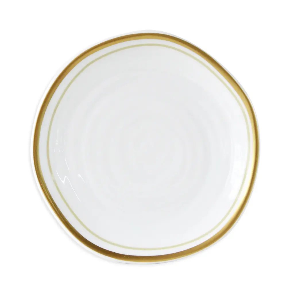 The lively, organic profile of this white ceramic bowl is equal parts playful and stylish. With a matte finish, the textural body and beautiful gold accent that adorns the rim are even more pronounced. This gorgeous accent can be placed by itself or paired with its larger twin to further enhance the look.