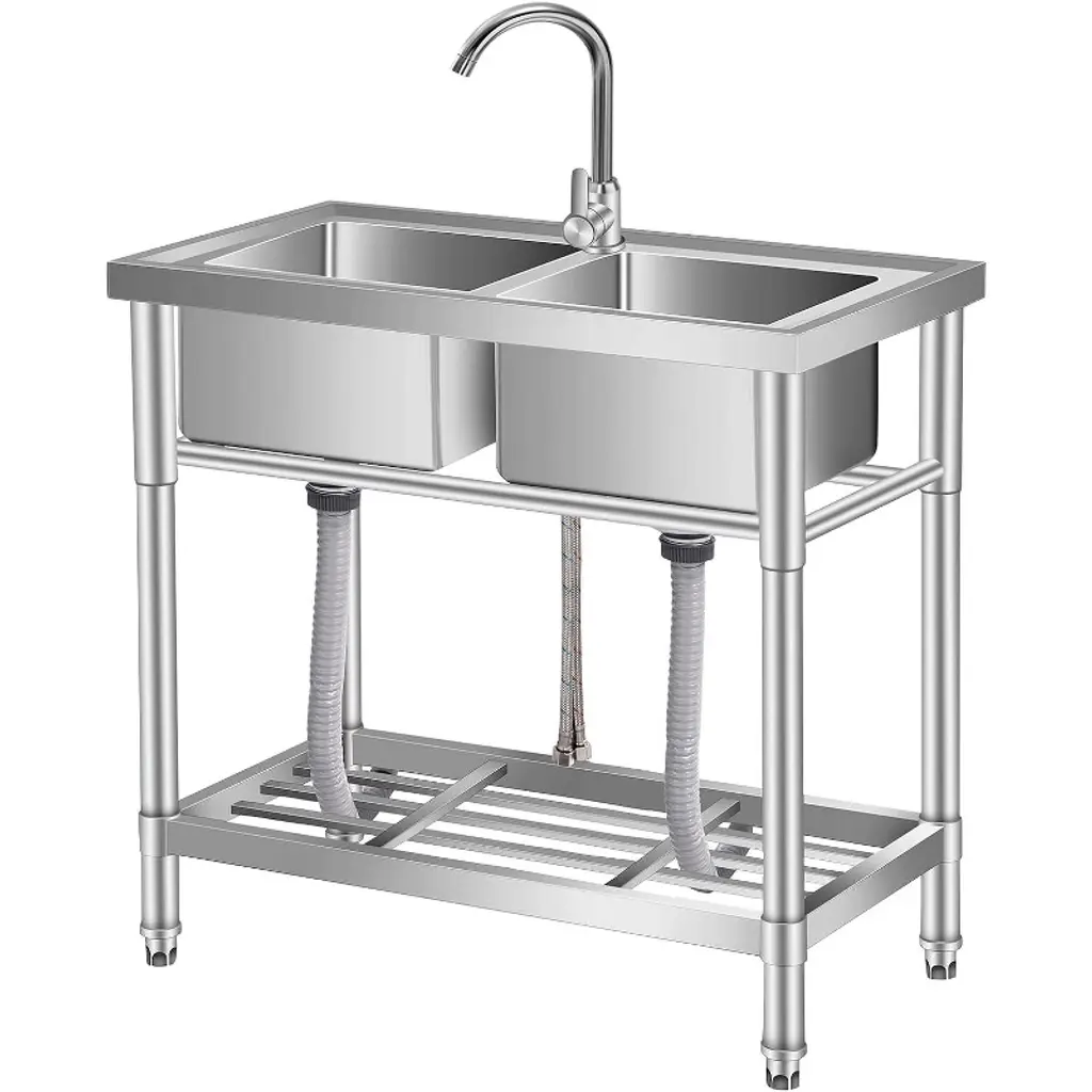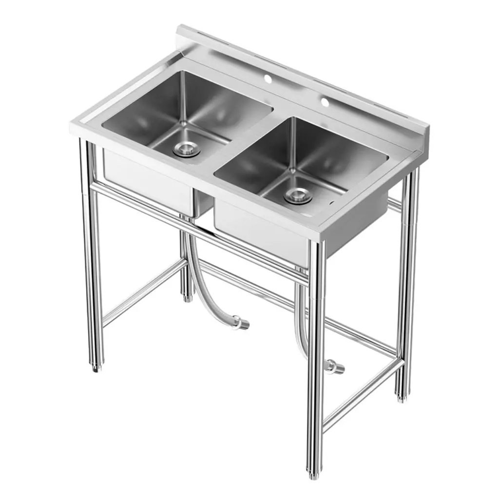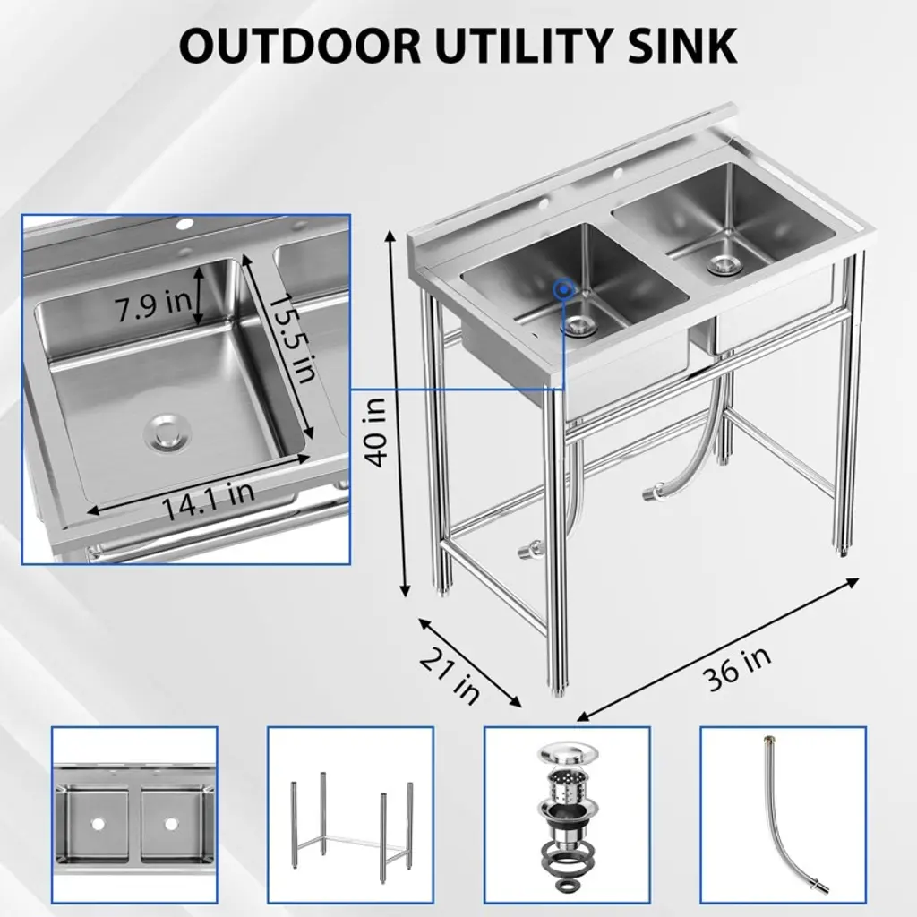 Product Details: Material: Premium stainless steel, polypropylene, and metal construction for superior corrosion and oxidation resistance Dimensions: 38" L x 23" W x 14" H (double bowl) Features: Spacious double bowl design for soaking, cleaning, and draining; adjustable legs for stability on uneven floors; multilayer sealed drainage system with removable filter basket; thick polypropylene pipes for rapid, flexible drainage Faucet: Premium 304 stainless steel hot & cold faucet with ceramic valve core for smooth, leak-resistant control Color: Stainless Steel Suitable For: Commercial kitchens, bars, restaurants, garages, backyard, and home utility use Description: Enhance your workspace with this freestanding double bowl laundry sink crafted from premium stainless steel, polypropylene, and metal for exceptional corrosion and oxidation resistance. Measuring 38" x 23" x 14", it offers ample space for soaking, cleaning, and draining large loads. The durable all-metal construction ensures long-lasting performance, while adjustable legs provide firm stability on uneven surfaces. The advanced multilayer sealed drainage system features a removable filter basket and thick polypropylene pipes to prevent blockages and promote rapid drainage. The sink¡¯s premium 304 stainless steel hot and cold faucet with ceramic valve core delivers smooth and leak-proof water control. Perfectly suited for commercial kitchens, bars, restaurants, garages, and backyard use, this versatile sink accommodates various tasks like food prep, dishwashing, pet baths, and general utility work. A built-in knife storage compartment enhances safety and organization by securely storing sharp tools out of children¡¯s reach, promoting an efficient and tidy workspace. After-Sales Service: Customer support available for installation assistance, maintenance guidance, and warranty support. What You Will Receive: One freestanding double bowl laundry sink with installed hot & cold faucet, adjustable legs, multilayer drainage components including removable filter basket, built-in knife storage, and assembly instructions. Applicable Scenarios: Ideal for commercial kitchens, bars, restaurants, garages, backyard spaces, laundry rooms, and home utility areas