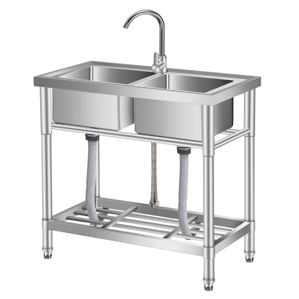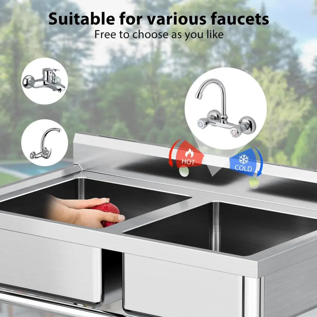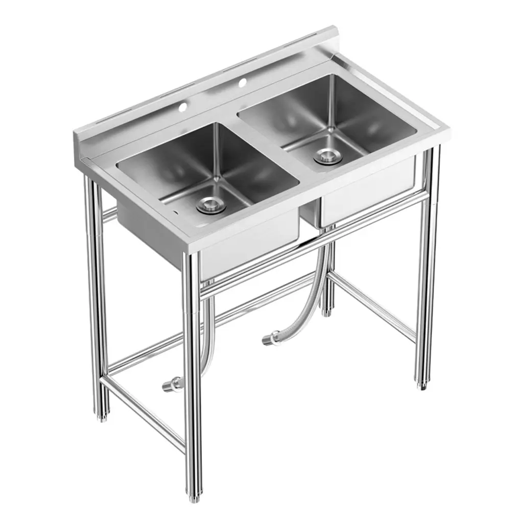 Product Details: Material: Premium stainless steel, polypropylene, and metal construction for superior corrosion and oxidation resistance Dimensions: 38" L x 23" W x 14" H (double bowl) Features: Spacious double bowl design for soaking, cleaning, and draining; adjustable legs for stability on uneven floors; multilayer sealed drainage system with removable filter basket; thick polypropylene pipes for rapid, flexible drainage Faucet: Premium 304 stainless steel hot & cold faucet with ceramic valve core for smooth, leak-resistant control Color: Stainless Steel Suitable For: Commercial kitchens, bars, restaurants, garages, backyard, and home utility use Description: Enhance your workspace with this freestanding double bowl laundry sink crafted from premium stainless steel, polypropylene, and metal for exceptional corrosion and oxidation resistance. Measuring 38" x 23" x 14", it offers ample space for soaking, cleaning, and draining large loads. The durable all-metal construction ensures long-lasting performance, while adjustable legs provide firm stability on uneven surfaces. The advanced multilayer sealed drainage system features a removable filter basket and thick polypropylene pipes to prevent blockages and promote rapid drainage. The sink¡¯s premium 304 stainless steel hot and cold faucet with ceramic valve core delivers smooth and leak-proof water control. Perfectly suited for commercial kitchens, bars, restaurants, garages, and backyard use, this versatile sink accommodates various tasks like food prep, dishwashing, pet baths, and general utility work. A built-in knife storage compartment enhances safety and organization by securely storing sharp tools out of children¡¯s reach, promoting an efficient and tidy workspace. After-Sales Service: Customer support available for installation assistance, maintenance guidance, and warranty support. What You Will Receive: One freestanding double bowl laundry sink with installed hot & cold faucet, adjustable legs, multilayer drainage components including removable filter basket, built-in knife storage, and assembly instructions. Applicable Scenarios: Ideal for commercial kitchens, bars, restaurants, garages, backyard spaces, laundry rooms, and home utility areas