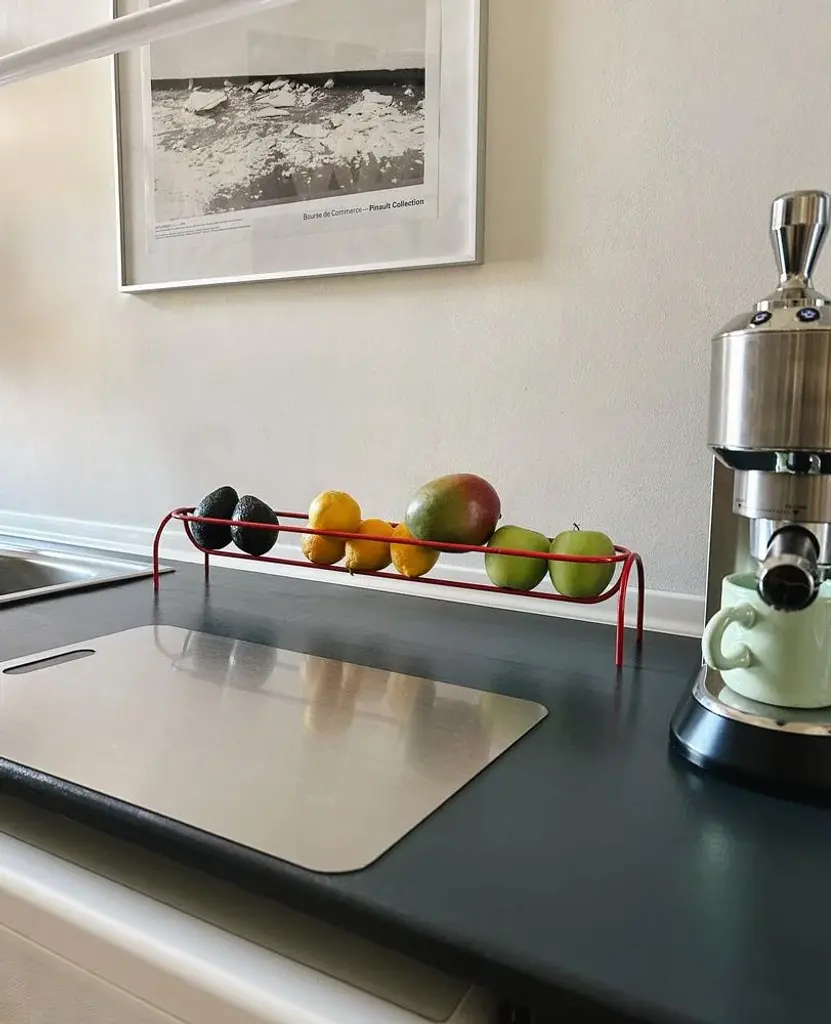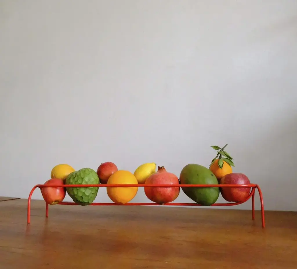 Inspired by the fluidity and unpredictability of nature, the unique fruit bowl challenges conventional design. Three lines. That’s it. ‘The long Bowl’ is a 60cm-long fruit bowl reduced to its purest form—lightweight, bold, and surprisingly functional. Designed to elevate everyday produce into a visual statement.Despite its reductive design, it holds a generous amount of fruit—making it both sculptural and practical.A sculptural object that transitions from fruit bowl to serving tray with ease. Better Airflow for Fresher Produce: My design ensures optimal airflow around your fruits and vegetables, keeping them dry and well-ventilated. This helps reduce moisture buildup, slowing down spoilage and mold, so your produce stays fresh for longer. Easy-to-Clean, Hygienic Coating: The powder-coated steel wires not only look sleek but also resist rust and bacteria. The smooth, non-porous surface is easy to wipe down, helping to keep your produce in a cleaner, healthier environment. Imprinted by Maker
