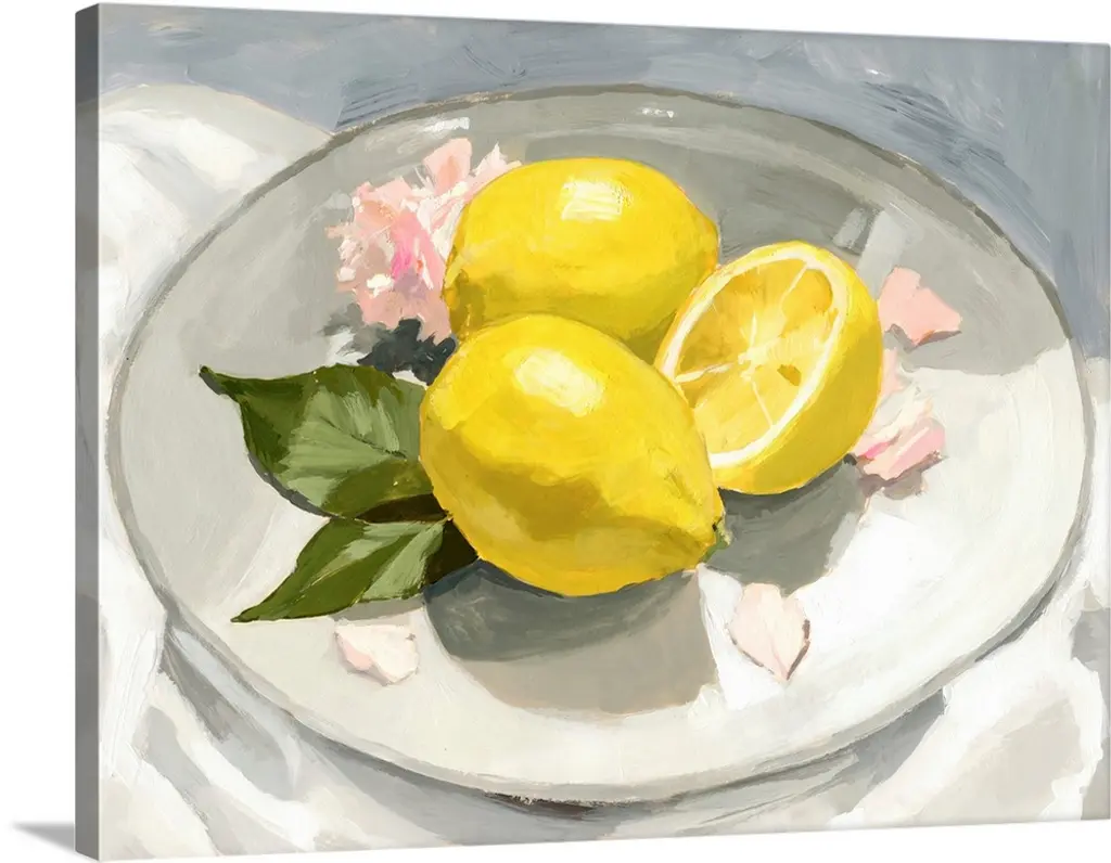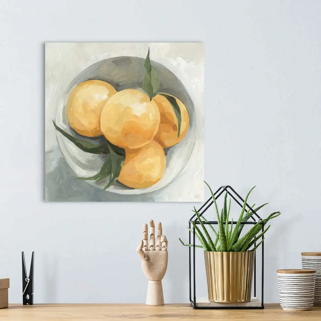 A square contemporary painting of a gray bowl full of lemons.