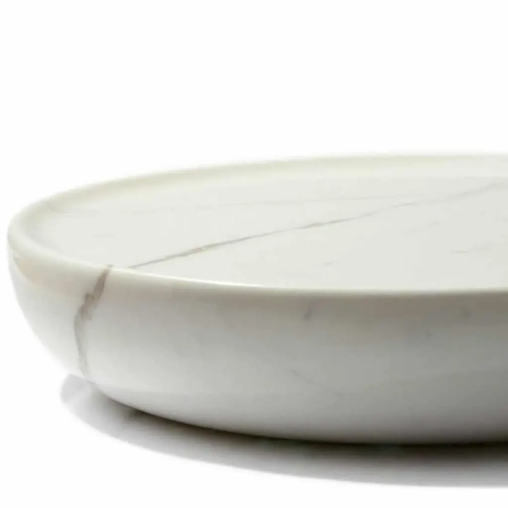 Full bowls are on the point of overflowing. The precious marble is crafted into a form that makes a liquid form solid. They function normally as bowls only sharing the expected volume with the object itself. This makes them ideal for displaying small amounts of beautiful food or objects. Each full bowl is hand-turned in Italy from marble. Variations in grain and colouring make each bowl unique.This piece is made of white Statuario Marble.