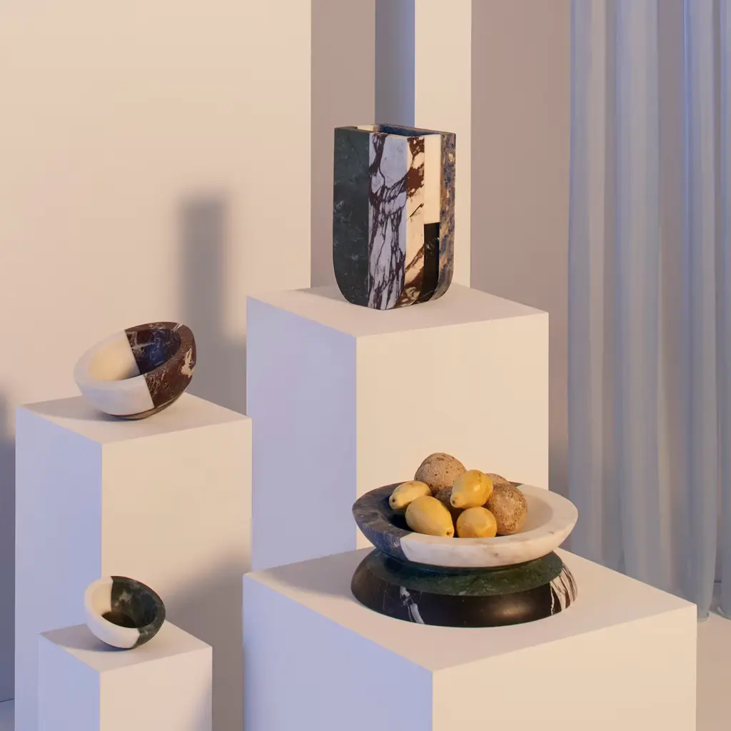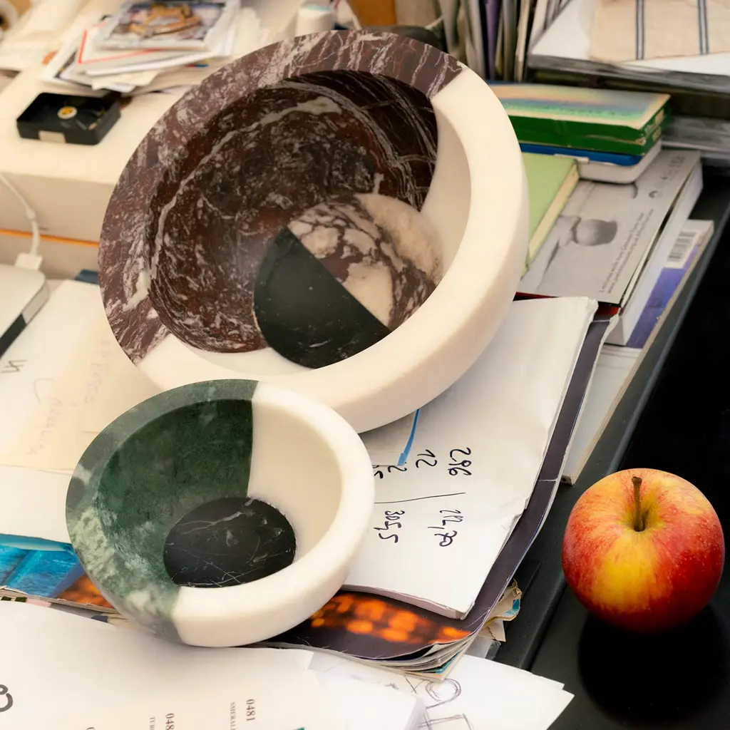 Designer Arthur Arbesser's commitment to a multidisciplinary inspiration for his designs is impeccably exemplified by this striking bowl. Crafted juxtaposing black Marquina, white Michelangelo, and green Guatemala marble for a colorful and glamorous look, the piece appears in a deceptively unstable equilibrium delivering high visual impact and making it ideal to store bonbons as well as purely decorative items like potpourri. Not water-tight, please avoid filling with liquids. Please note that marbles and stones are natural materials and they can differ also if coming from the same quarry or the same block. The product shown may differ from purchased items. Every piece is unique.