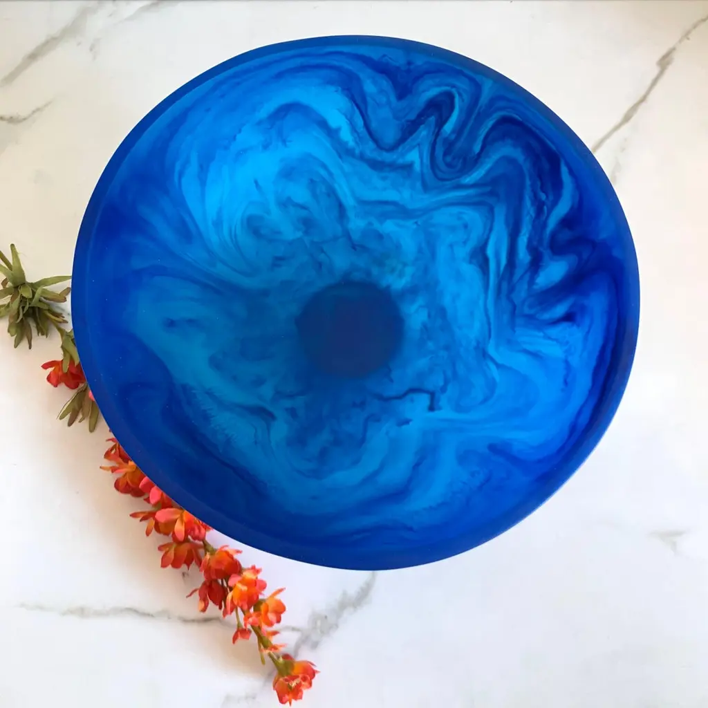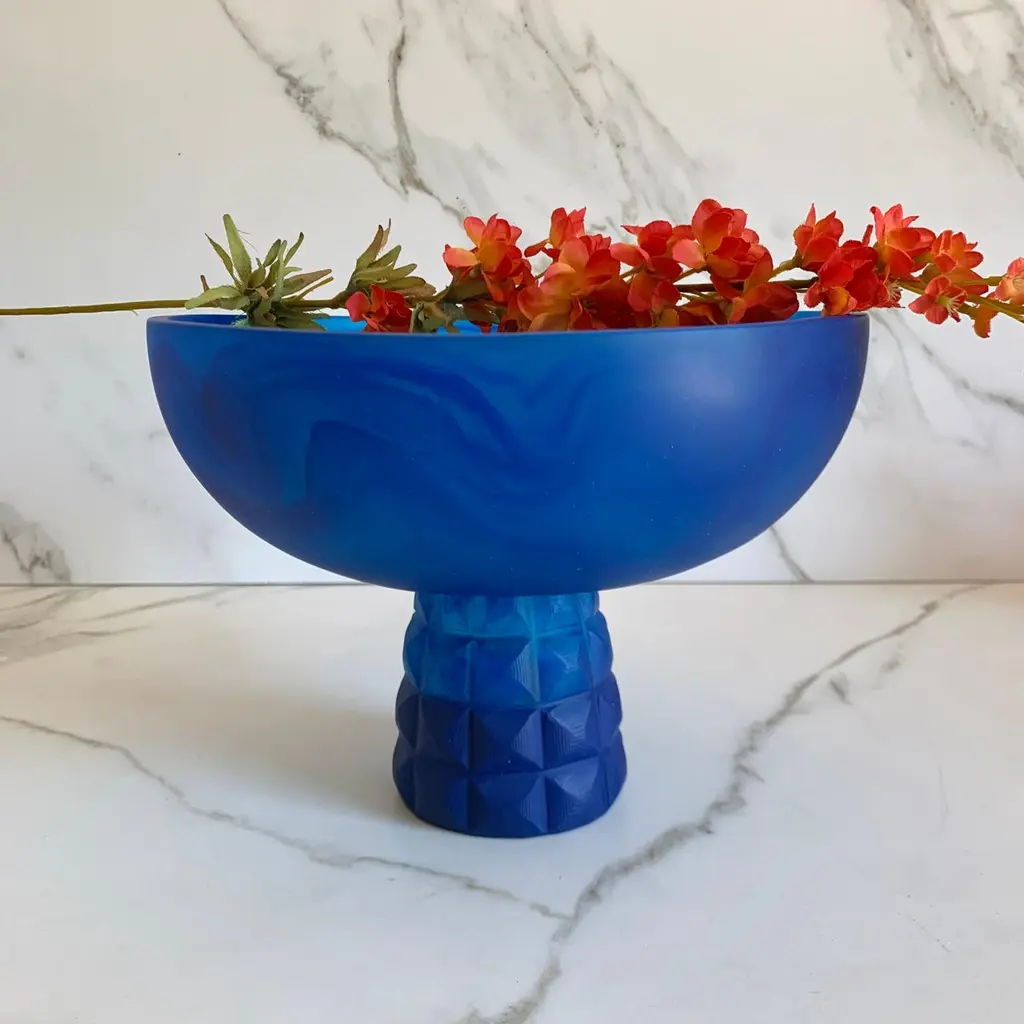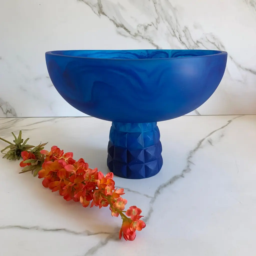 Geometric Pedestal Bowl In Blue Marbled Resin By Paola Valle