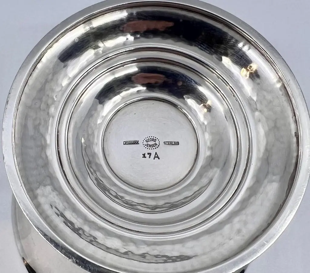 A vintage sterling silver Georg Jensen bowl, design #17A by Johan Rohde from 1912. Round footed stepped base with floral pedals holding a conical shaped bowl.Dimensions: Measures 4 1/8? in height and 4 1/4? in diameter (10.5cm, 11cm). Weighs 6.6oz (188g).Hallmarks: Vintage Georg Jensen hallmark used between 1945-1977.Weight: approximately 185 Grams (6,52 oz.)In the extra group image, this is the smaller bowl.All our items have been professionally polished by our Georg Jensen trained silversmith and are in excellent condition.