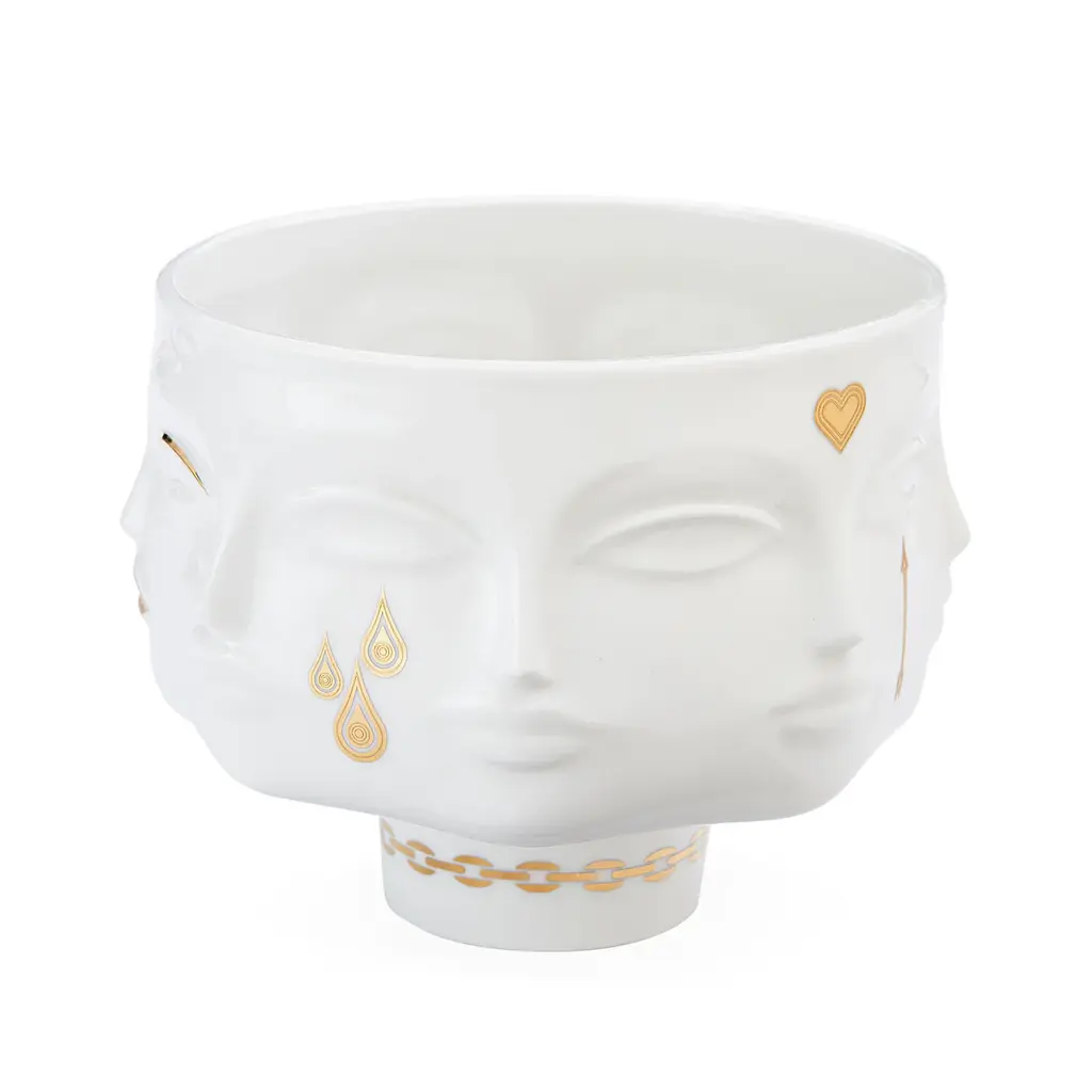 Golden Rule. We've given our iconic Muse collection a face lift. Actually, more like a de -face lift. Subversive signs and symbols rendered in glittering gold adorn the glossy high fired porcelain pieces—signature favorites with the glamour cranked up to 11. A lovely looker that gives good face from every angle. Inspired by Dora Maar, the French photographer, poet, and painter also known as Pablo Picasso’s lover and muse. Jonathan sculpts and throws the models for our Muse pottery and then substitutes our signature geometric relief patterns with body parts—faces, breasts, lips—to create a surreal style. Pieces are inspired by our favorite artists' muses.