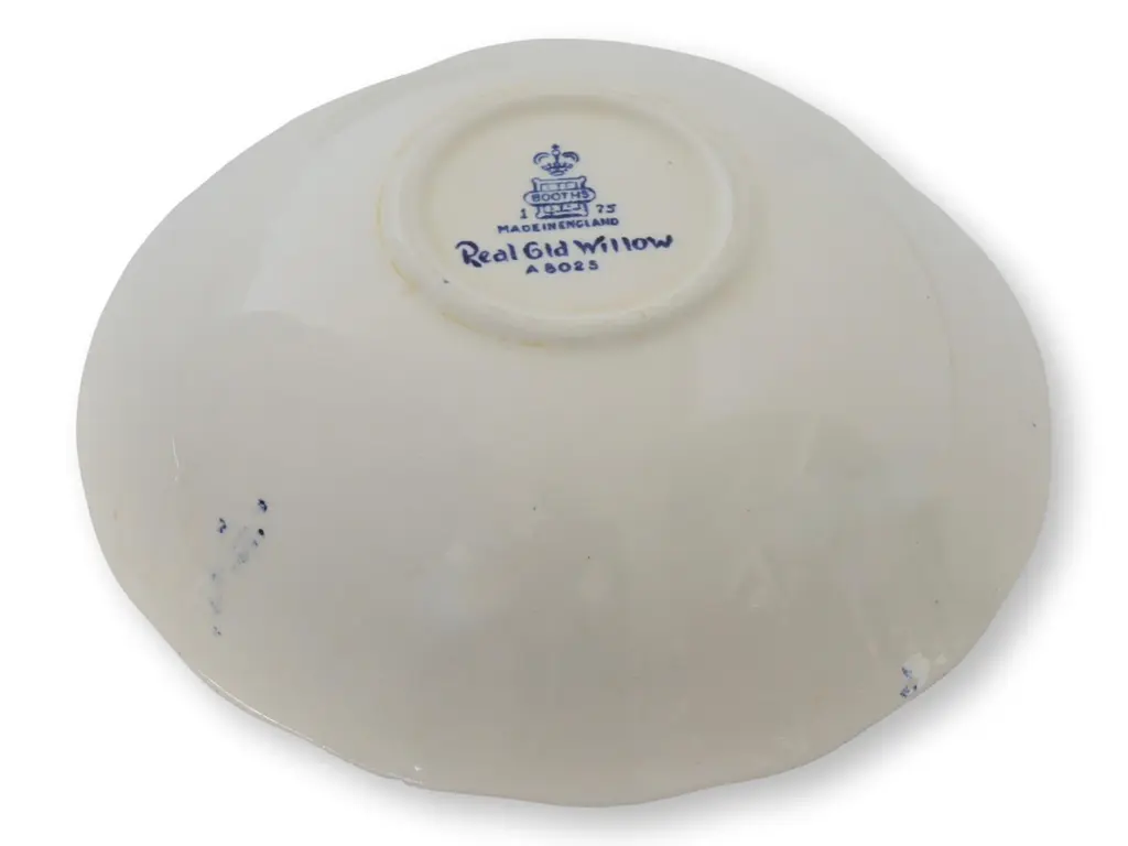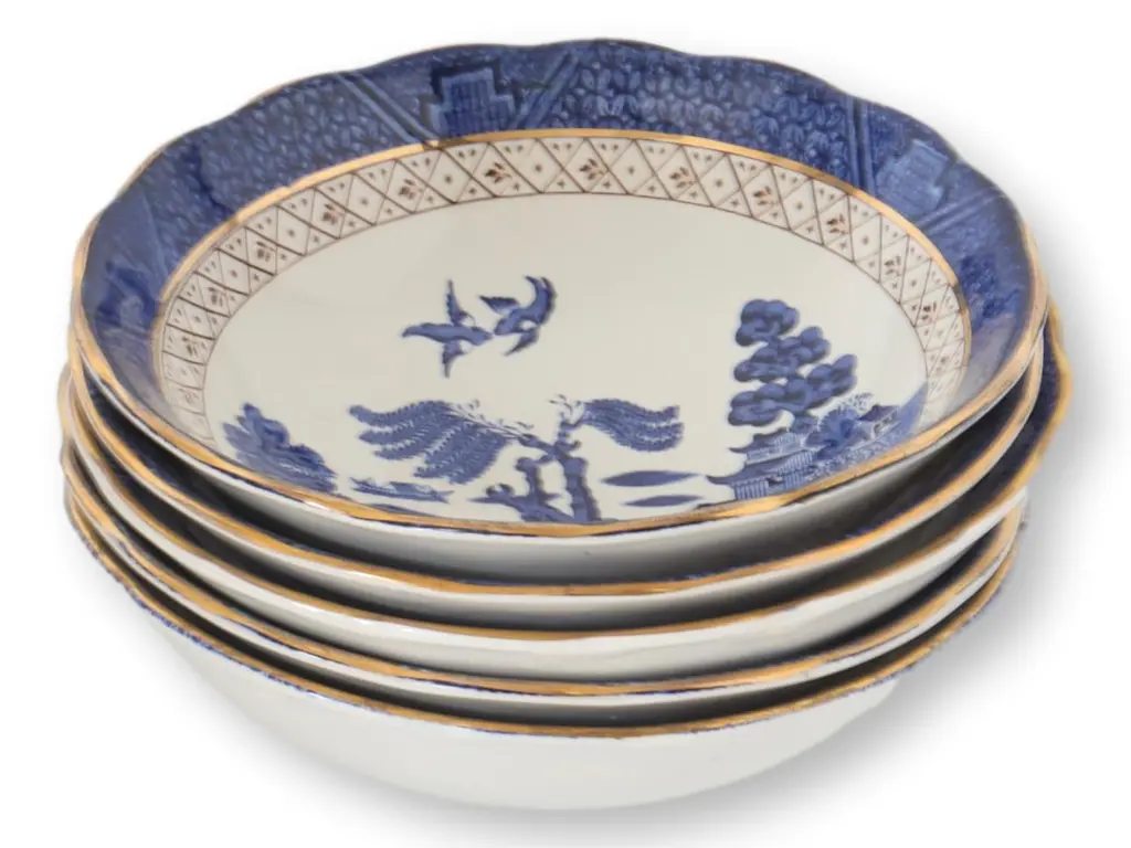 Elevate your dining experience with our set of five English Willow pattern soup/cereal bowls with gilt edge. They are proudly crafted by Booth's, a renowned maker from the early 20th century. These bowls epitomize timeless elegance and rich history. Perfect for soups or cereals, they bring a touch of classic English charm to your table.