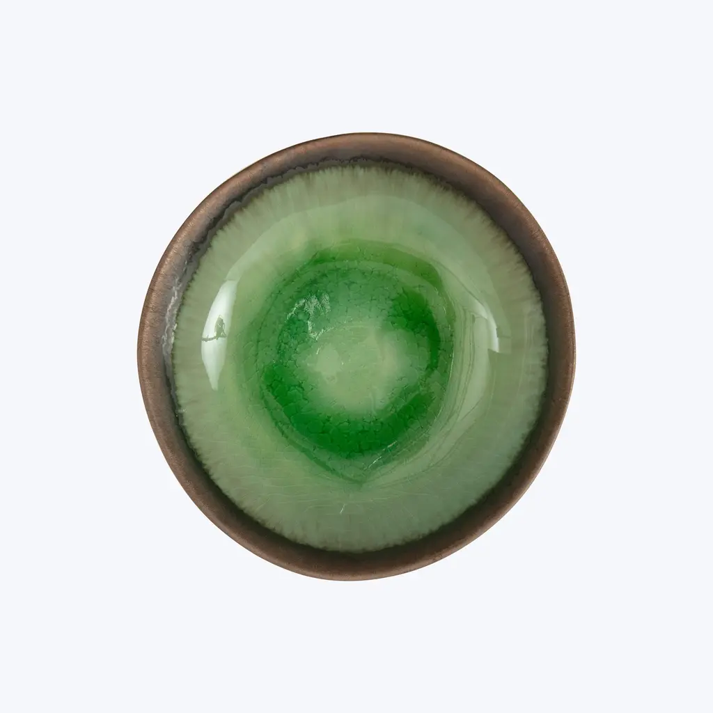 Fusing Eastern and Western styles, philosophies, and techniques, stoneware ceramics are crafted in Thailand. Cool tones brilliantly crackle in a marine habitat - a play of shadows, light, and texture. Each piece features one-of-a-kind crystalized designs inspired by pools of water.