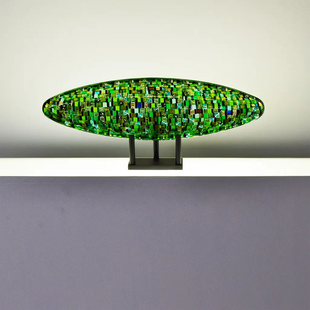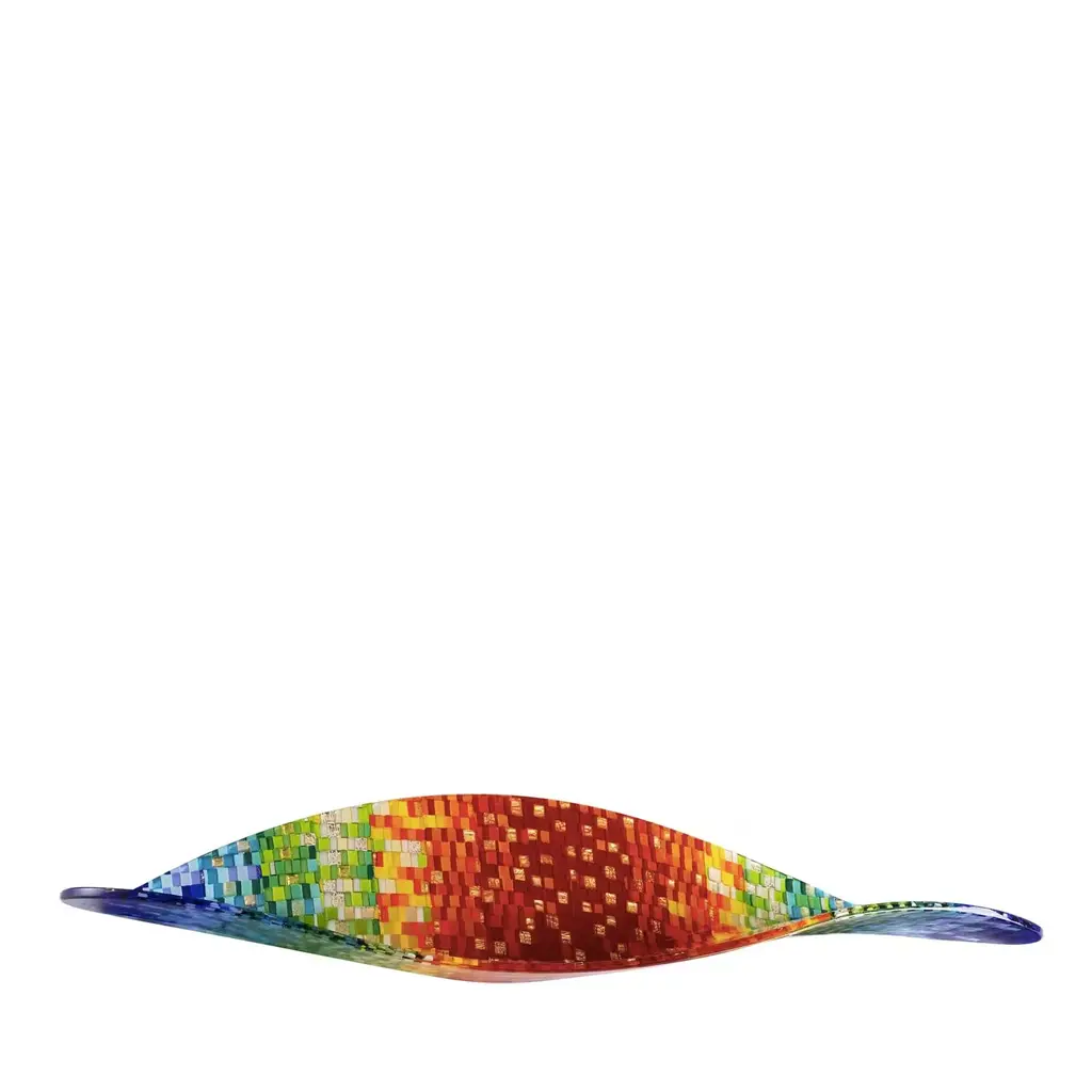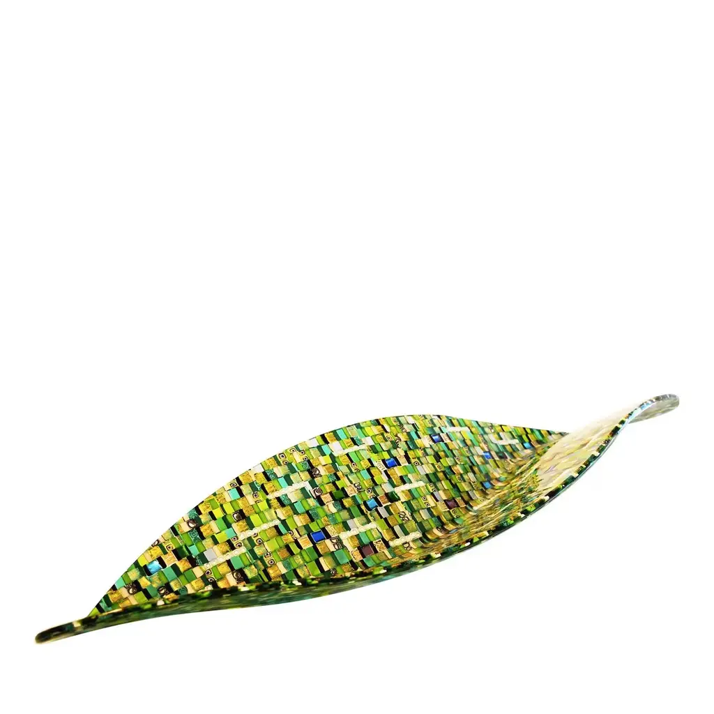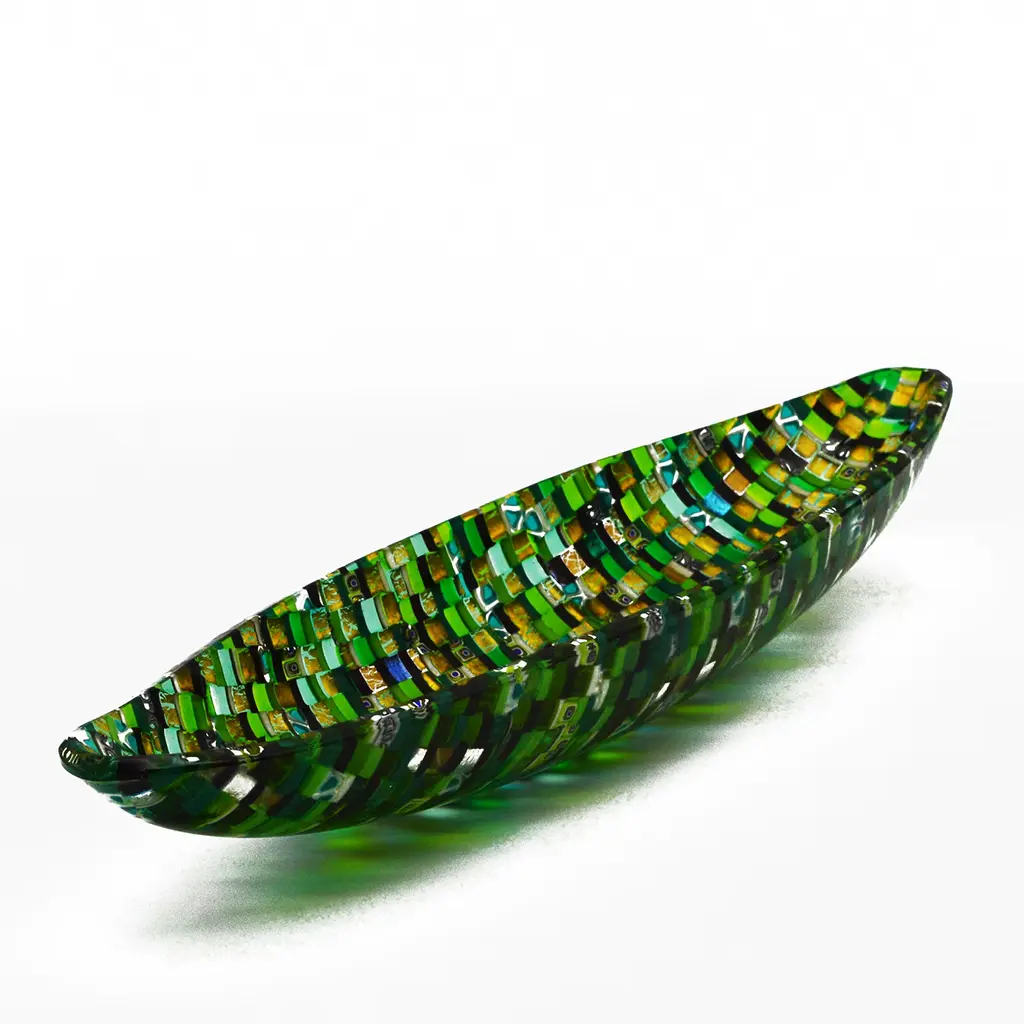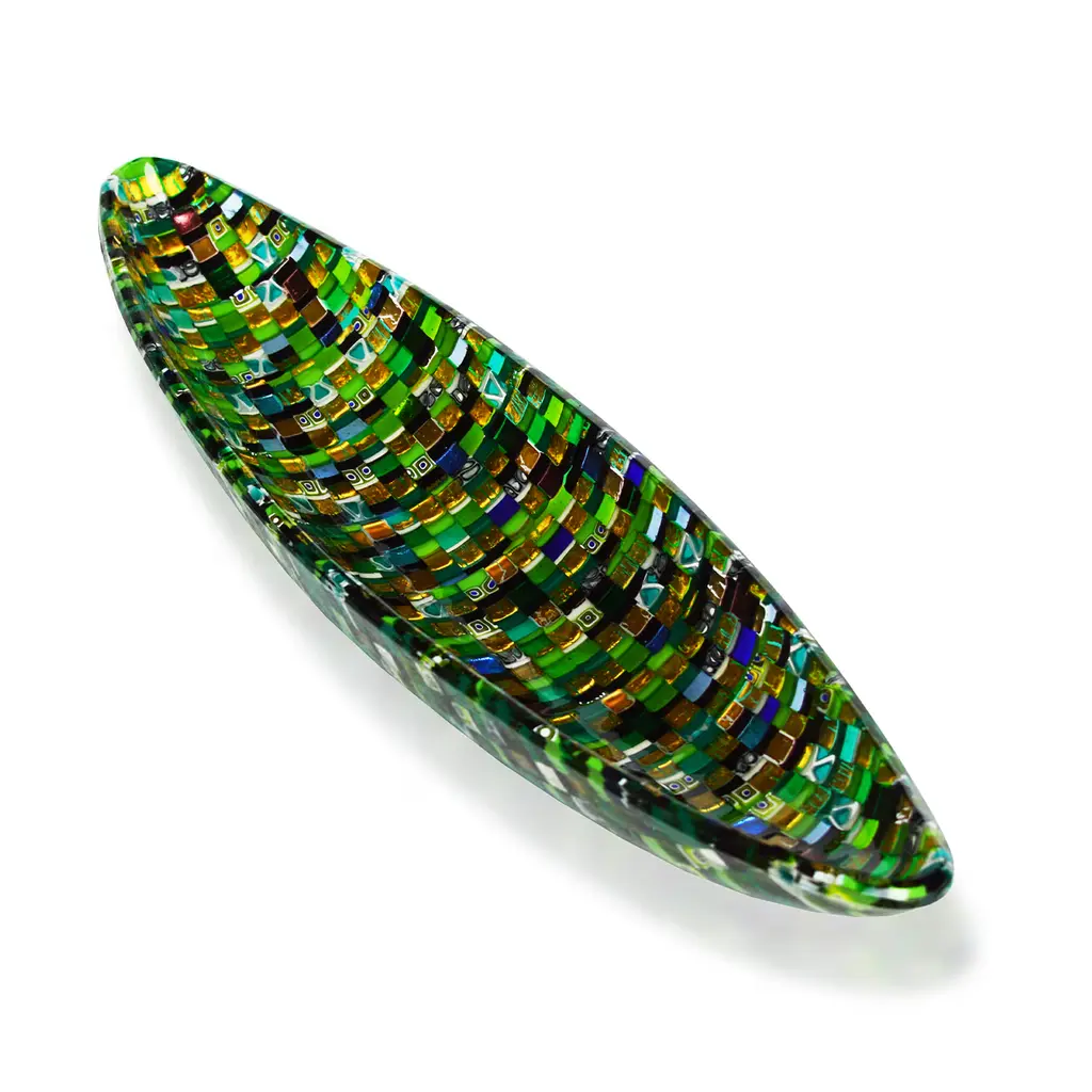 An eloquent design celebrating Venice, this gondola-shaped centerpiece bowl is sure to capture the eye with its colorful contrasting glass tiles. A painstaking process of manual assembly is behind its mosaic-like design, as hypnotizing in its pattern as it is in color where vibrant green tones unmistakably prevail. Precious gold leaf inserts seal the piece's luxury.