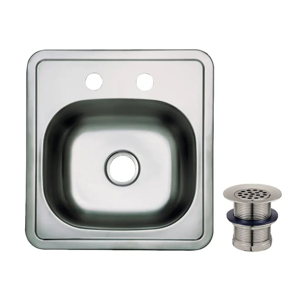 Upgrade your kitchen with the self-rimming stainless steel single bowl bar sink from the Studio Collection by Kingston Brass. Its spacious 12" x 9" bowl and 6" depth make it a versatile choice, perfect as a bar or as a secondary sink in a larger setup. Pre-drilled for a two hole faucet at 4" center to center, this sink offers a seamless and stylish look, while its self-rimming design ensures a quick and hassle-free installation. Durable, functional, and designed with modern convenience in mind, this sink is the ideal addition to any bar or kitchen space.FeaturesItem weight: 4.41 lbs.Fabricated from 18 gauge 304 grade stainless steel for added durabilityNo sink legs needed4" centerset two-hole faucet mountIncludes integral rectangular lavatory bowlMinimum cabinet size: 17-15/16"Overall dimensions: (L)14-15/16" x (W)14-15/16" x (H)6-3/16"Bowl dimensions: (L)12" x (W)9-1/4" x (D)6"2-1/16" drain hole diameterCenter drain placementBacksplash not neededDoes not include overflow holePolished stainless steel provides scratch and stain-resistanceWater supply kit sold separatelyProfessional installation recommendedIncludes mounting hardware and installation template