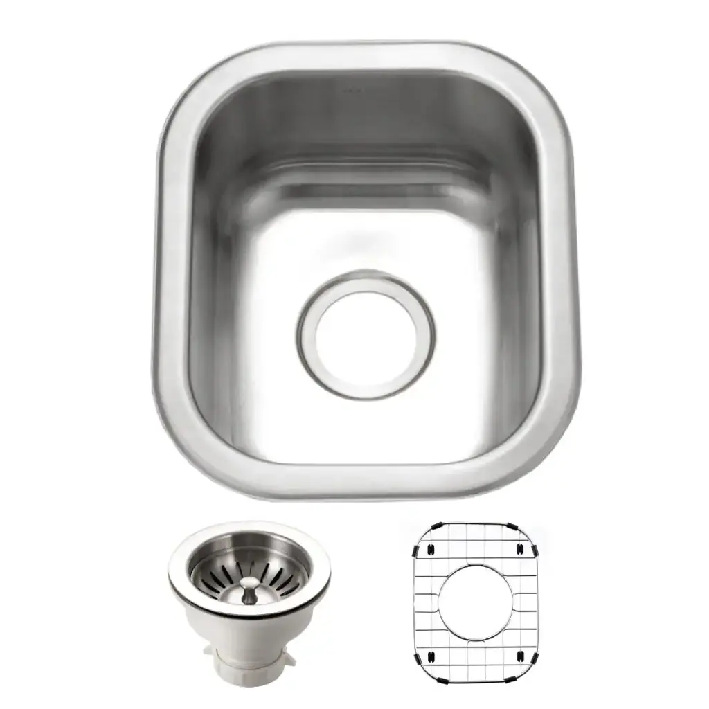 Upgrade your kitchen with the self-rimming stainless steel single bowl bar sink from the Studio Collection by Kingston Brass. Its spacious 12" x 9" bowl and 6" depth make it a versatile choice, perfect as a bar or as a secondary sink in a larger setup. Pre-drilled for a two hole faucet at 4" center to center, this sink offers a seamless and stylish look, while its self-rimming design ensures a quick and hassle-free installation. Durable, functional, and designed with modern convenience in mind, this sink is the ideal addition to any bar or kitchen space.FeaturesItem weight: 4.41 lbs.Fabricated from 18 gauge 304 grade stainless steel for added durabilityNo sink legs needed4" centerset two-hole faucet mountIncludes integral rectangular lavatory bowlMinimum cabinet size: 17-15/16"Overall dimensions: (L)14-15/16" x (W)14-15/16" x (H)6-3/16"Bowl dimensions: (L)12" x (W)9-1/4" x (D)6"2-1/16" drain hole diameterCenter drain placementBacksplash not neededDoes not include overflow holePolished stainless steel provides scratch and stain-resistanceWater supply kit sold separatelyProfessional installation recommendedIncludes mounting hardware and installation template