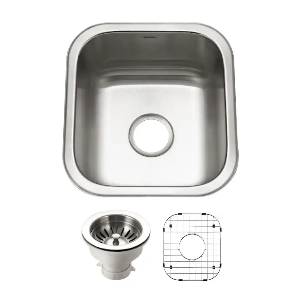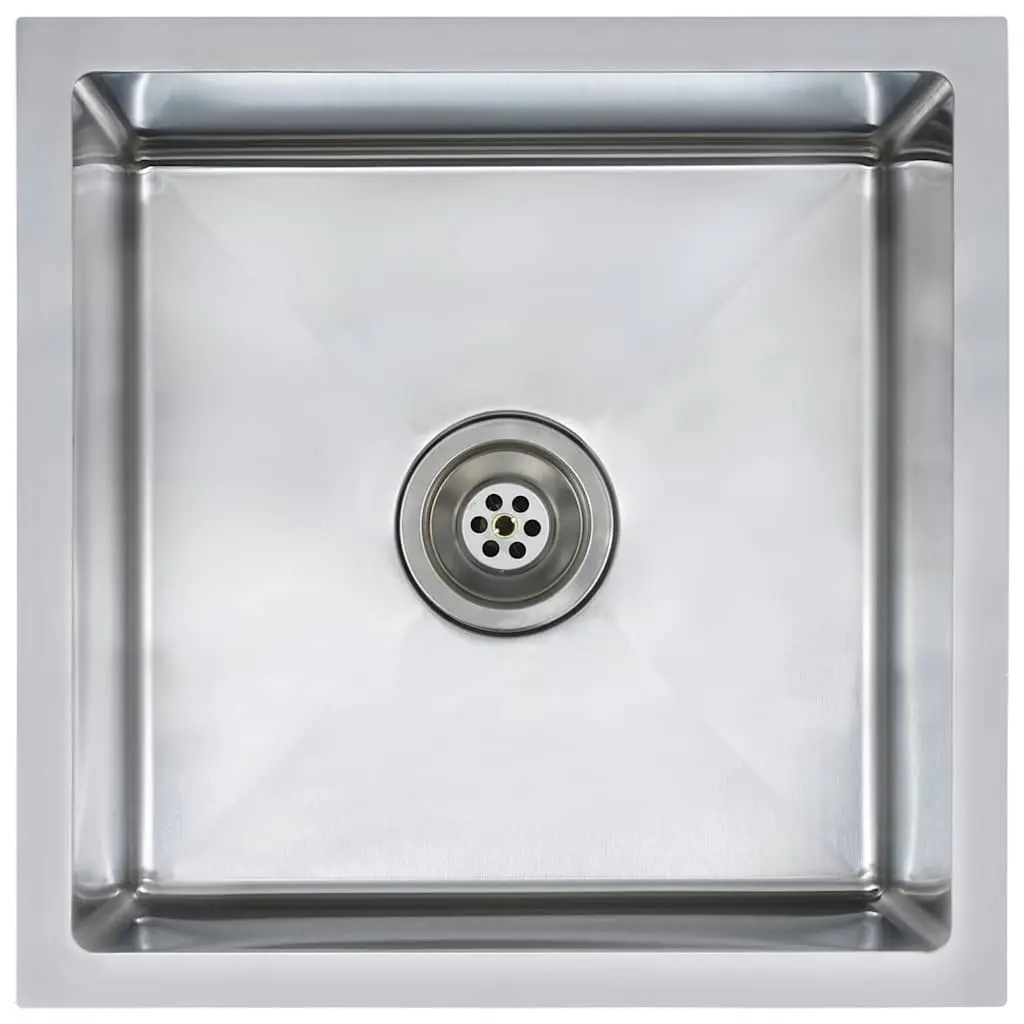 Upgrade your kitchen with the self-rimming stainless steel single bowl bar sink from the Studio Collection by Kingston Brass. Its spacious 12" x 9" bowl and 6" depth make it a versatile choice, perfect as a bar or as a secondary sink in a larger setup. Pre-drilled for a two hole faucet at 4" center to center, this sink offers a seamless and stylish look, while its self-rimming design ensures a quick and hassle-free installation. Durable, functional, and designed with modern convenience in mind, this sink is the ideal addition to any bar or kitchen space.FeaturesItem weight: 4.41 lbs.Fabricated from 18 gauge 304 grade stainless steel for added durabilityNo sink legs needed4" centerset two-hole faucet mountIncludes integral rectangular lavatory bowlMinimum cabinet size: 17-15/16"Overall dimensions: (L)14-15/16" x (W)14-15/16" x (H)6-3/16"Bowl dimensions: (L)12" x (W)9-1/4" x (D)6"2-1/16" drain hole diameterCenter drain placementBacksplash not neededDoes not include overflow holePolished stainless steel provides scratch and stain-resistanceWater supply kit sold separatelyProfessional installation recommendedIncludes mounting hardware and installation template
