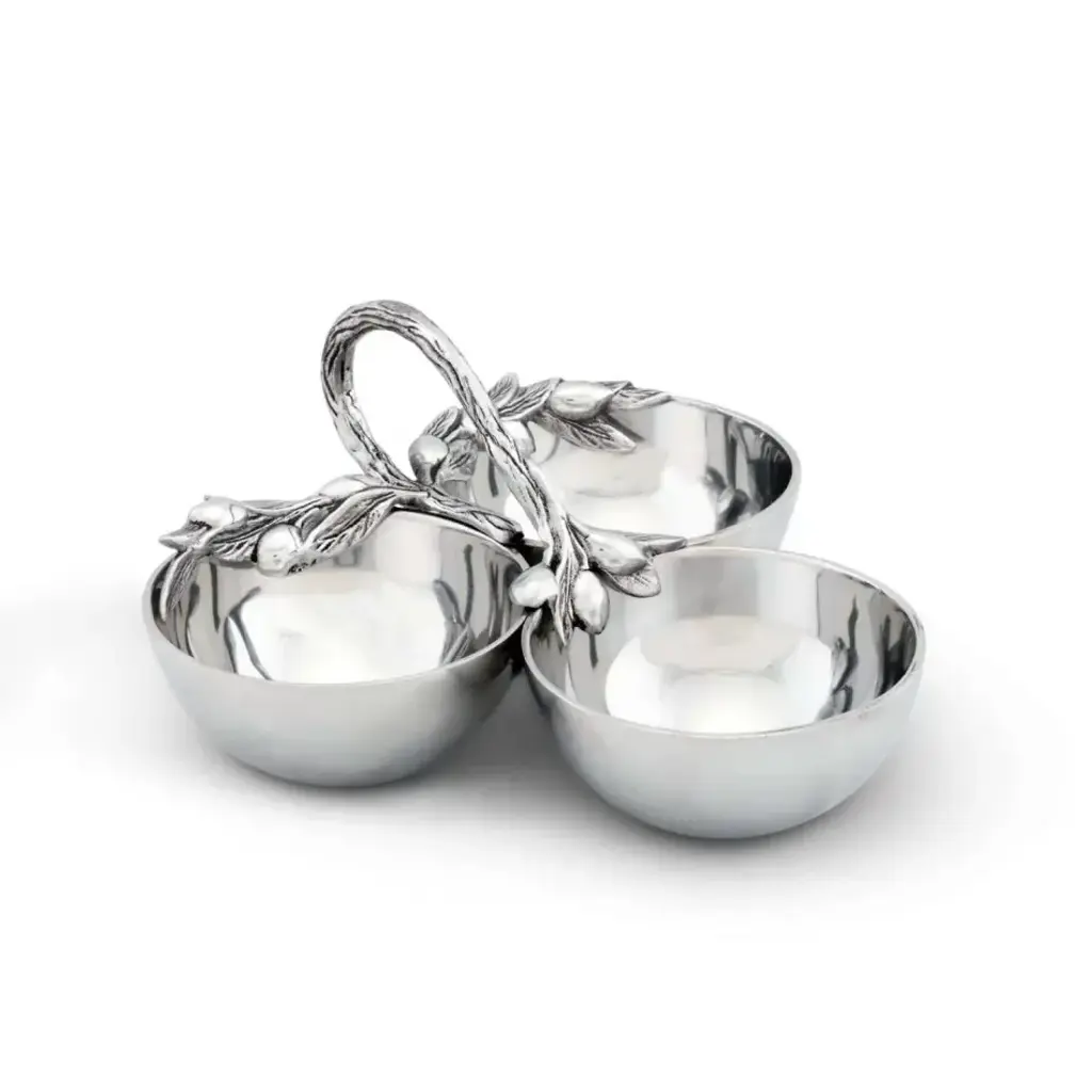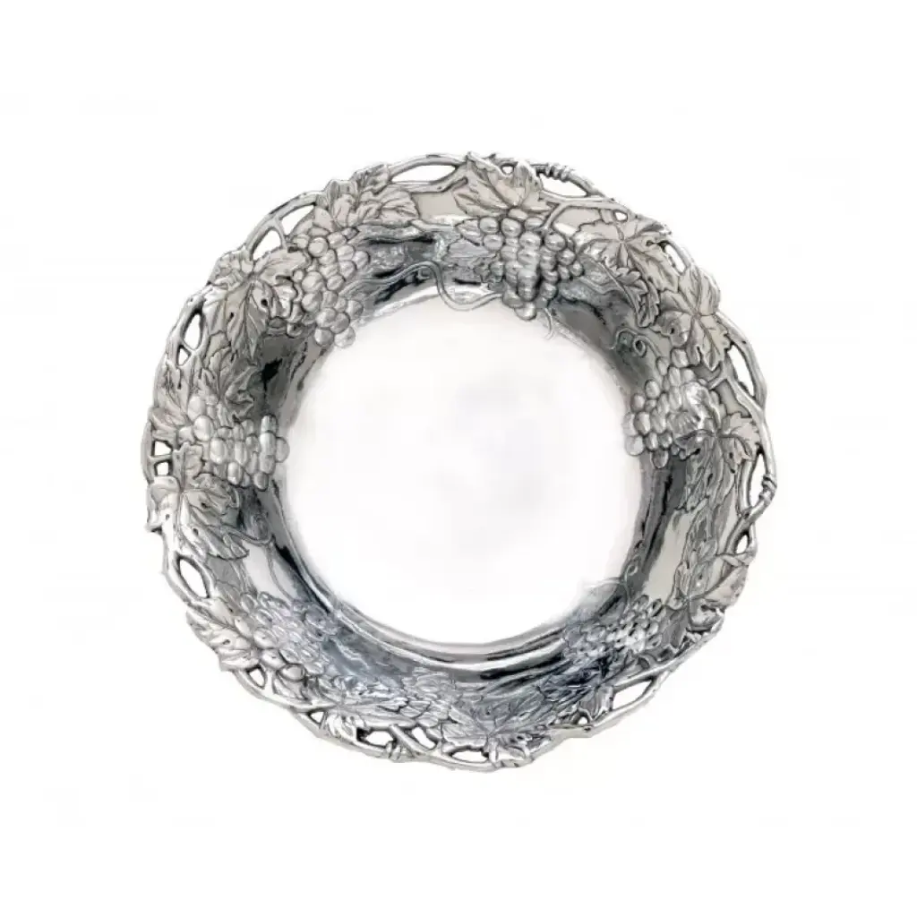 Harbor Arthur Court's tasteful 3-Tiered Grape Bowl on your table as a centerpiece or accent to serveware. A remarkable amount of detail distinguishes this piece, highlighted by the realistic leaves and grapes at the base. Bundles of fruit and foliage also litter the rim of each elevated bowl, while heavy lines within the tree-like stand give this handmade, aluminum piece even more definition.