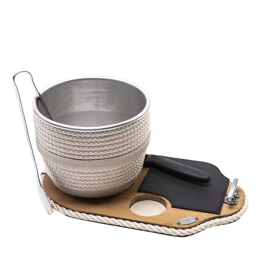 Modern and sophisticated, this elegant bowl with lid is a striking addition to a dinner, where it can be used to serve grated cheese, or tea and coffee as a splendid sugar bowl. Its timeless silhouette is crafted of steel and features a small handle and a secured lid. The decoration, inspired by marine themes, features a central gray-colored leather band with gray rope on top and creates a striking textural interplay that will be eye-catching on any occasion.