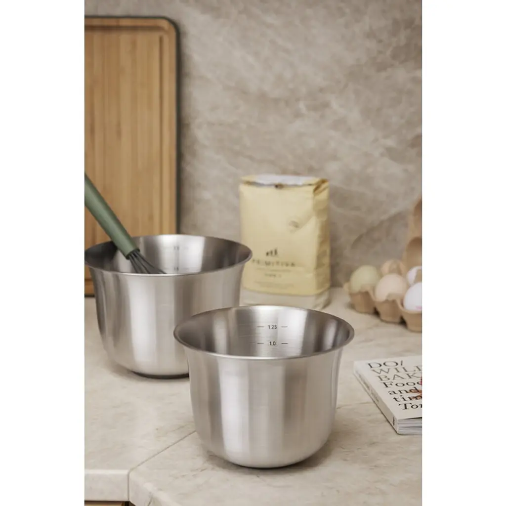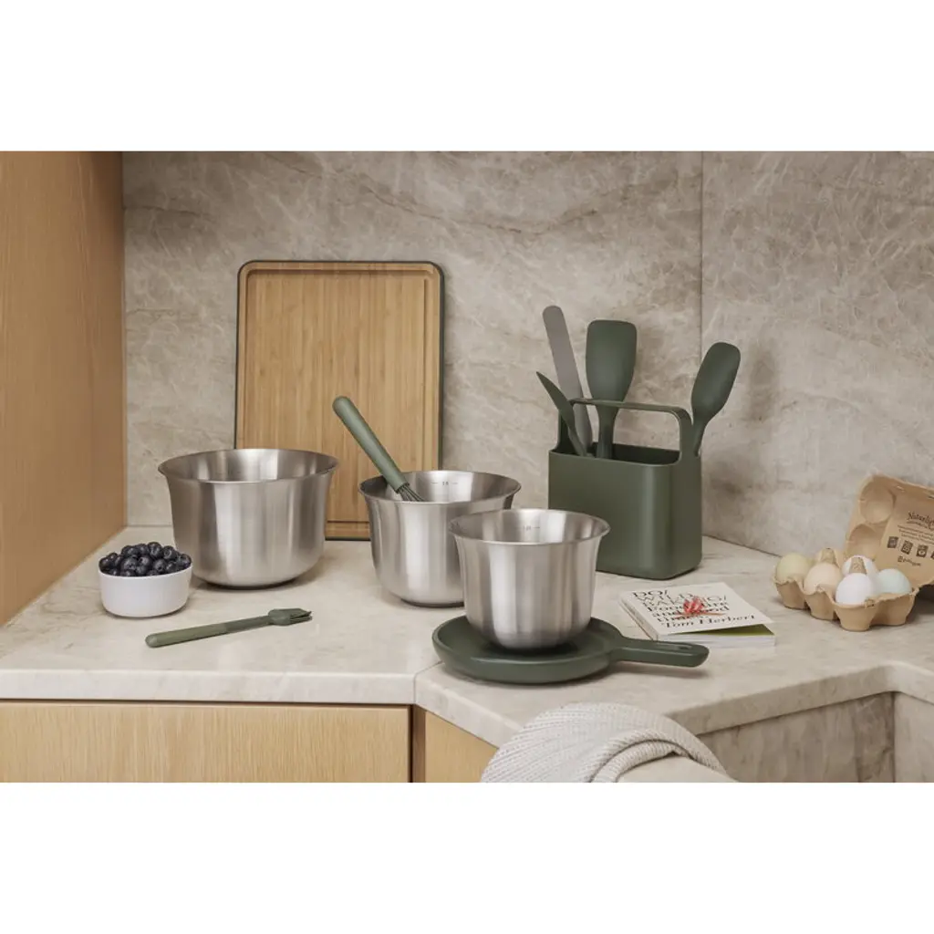 Eva Solo’s Green Tools mixing bowl is a multifunctional, stackable steel bowl – ideal for use as a dough bowl, baking bowl, or for everyday food prep. Made from 90% recycled stainless steel, the bowl is non-reactive, making it safe for both acidic and alkaline ingredients, as well as for food storage. With high sides and a rounded base, the mixing bowl is perfect for kneading dough, whipping cream, or setting up a bain-marie. Internal measuring marks allow for easy ingredient portioning directly in the bowl, while a silicone ring on the base keeps it stable on the countertop. With the Green Tools series, Eva Solo encourages everyone to increase the amount of vegetables in their diet – the products have been developed for plant-based cooking and optimized specifically for preparing vegetables and fruits. The clean-lined, ergonomic kitchen tools are multifunctional, however, and perfectly suited for all types of cooking, whether plant-based or not.