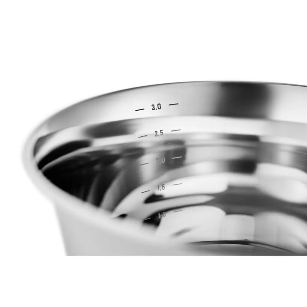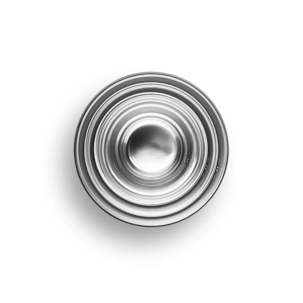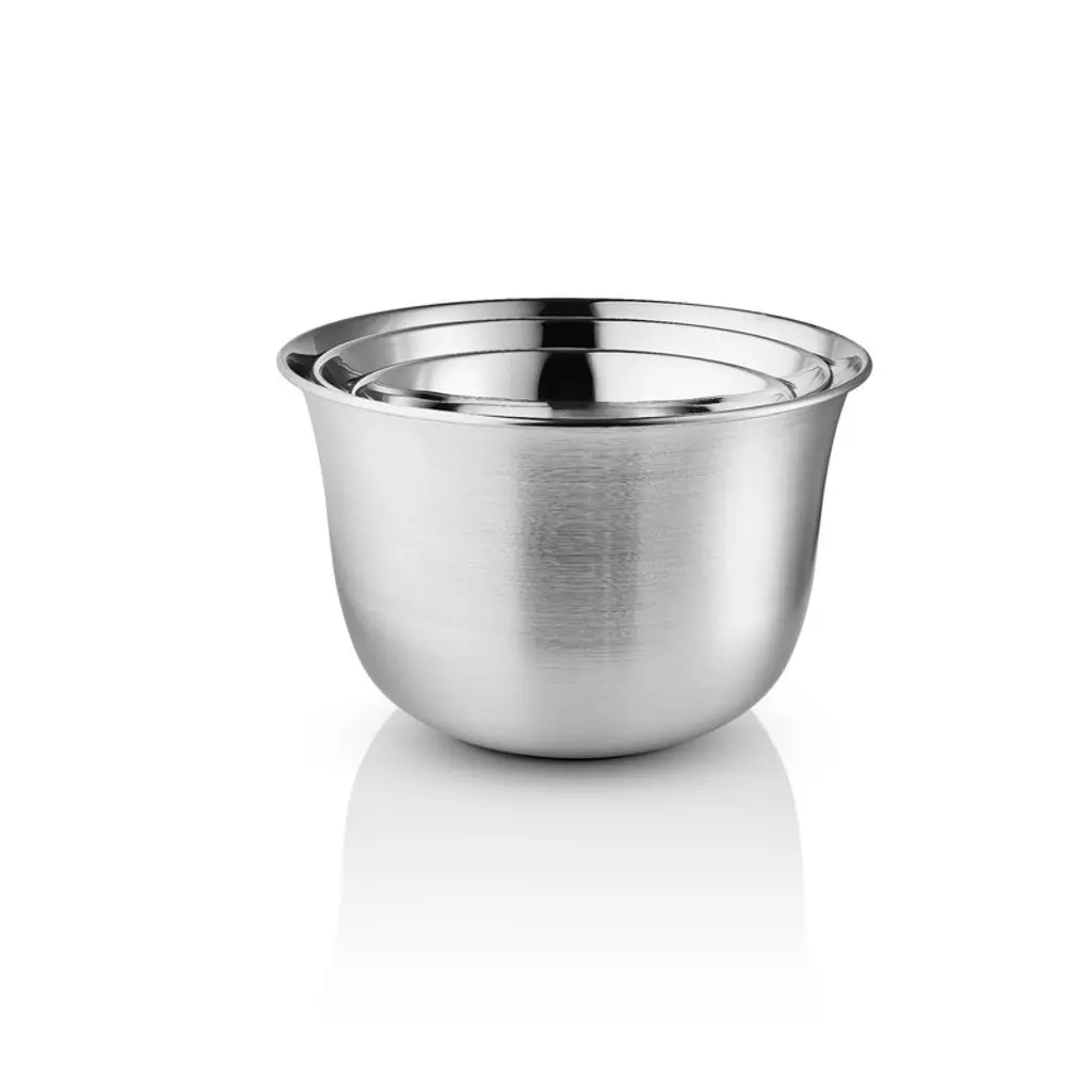 Eva Solo's Green Tools mixing bowl set includes three multifunctional, stackable steel bowls in different sizes – ideal as dough bowls, baking bowls, or for everyday food prep. Made from 90% recycled stainless steel, each bowl is non-reactive, making it safe for both acidic and alkaline ingredients, as well as for food storage. With high sides and a rounded base, the mixing bowls are perfect for kneading dough, whipping cream, or setting up a bain-marie. Internal measuring marks allow for easy ingredient portioning directly in the bowl, while a silicone ring on the base keeps it stable on the countertop. With the Green Tools series, Eva Solo encourages everyone to increase the amount of vegetables in their diet – the products have been developed for plant-based cooking and optimized specifically for preparing vegetables and fruits. The clean-lined, ergonomic kitchen tools are multifunctional, however, and perfectly suited for all types of cooking, whether plant-based or not.