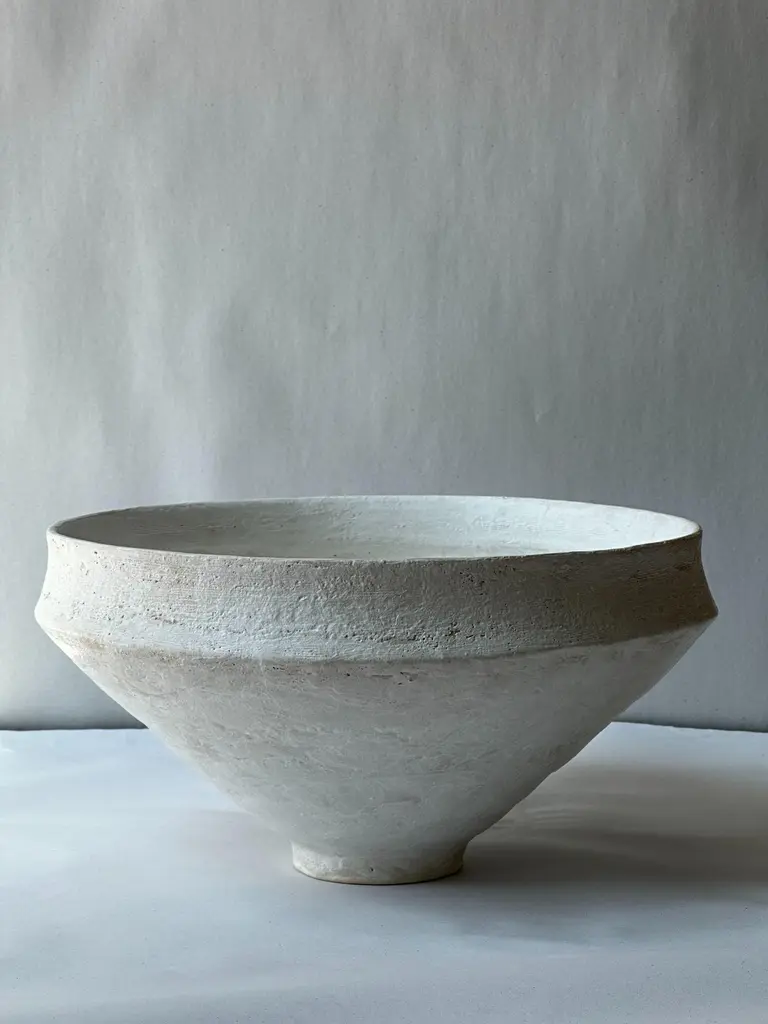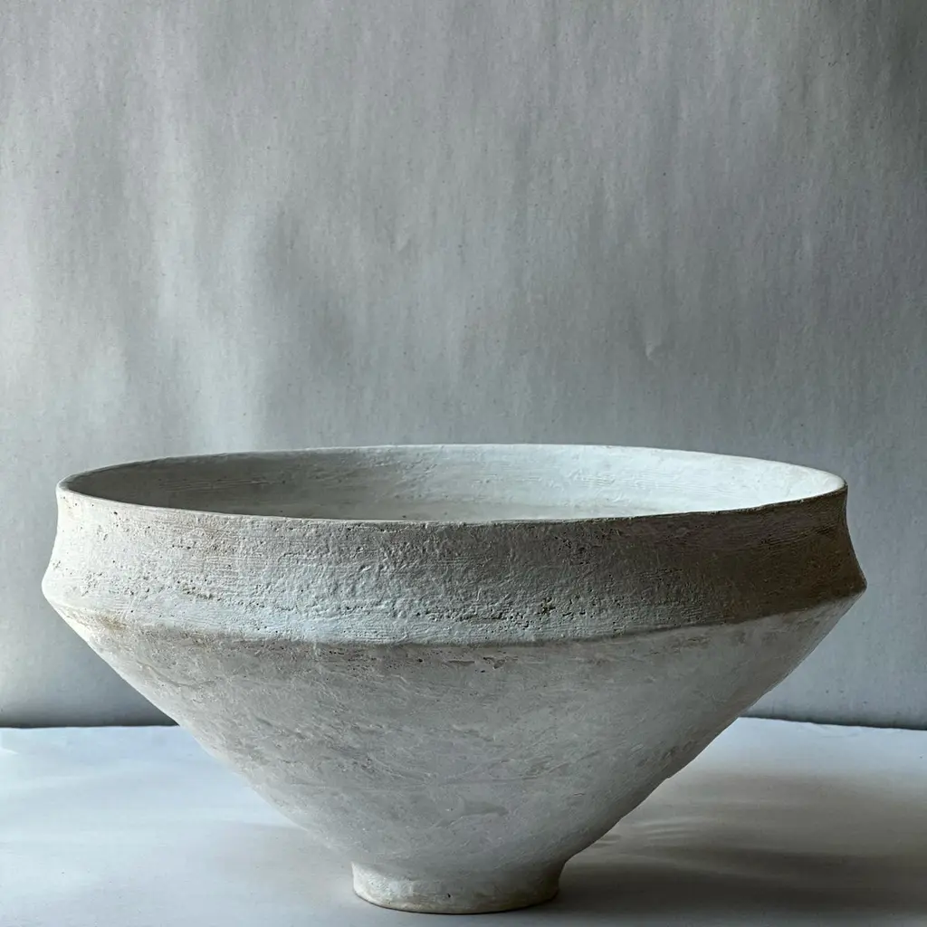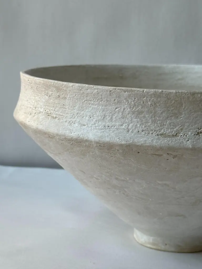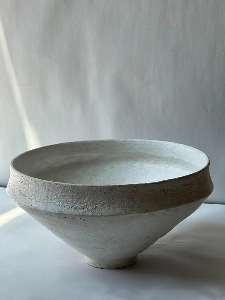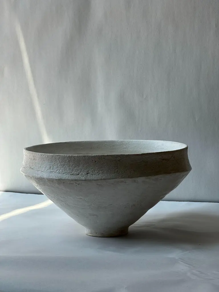 Grey Stoneware Roman Bowl by Elena VasilantonakiUniqueDimensions: ⌀ 28 x H 14 cm (Dimensions may vary)Materials: StonewareAvailable finishes: Black, White, Brown, Red White PatinaGrowing up in Greece I was surrounded by pottery forms that have changed little since the ancient times. Inspired by the various forms of those early vessels, I create works with an ancient feel and a minimalistic aesthetic, incorporating the principle of Japanese aesthetics of wabi sabi.The pieces are built entirely by hand with the coiling technique, in a variety of stoneware clays, red, black, white, brown, brushed with terra sigillata and\or experimental glazes and textured surface, resulting in slight variations with each piece.No watertight. Made in Athens, Greece.