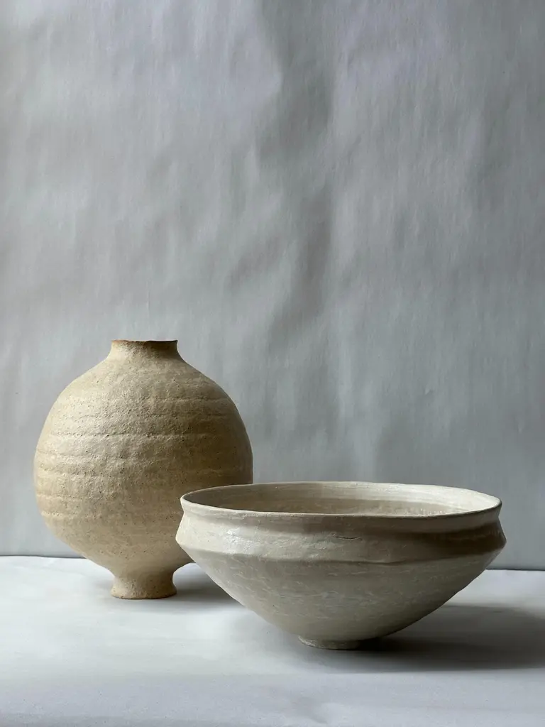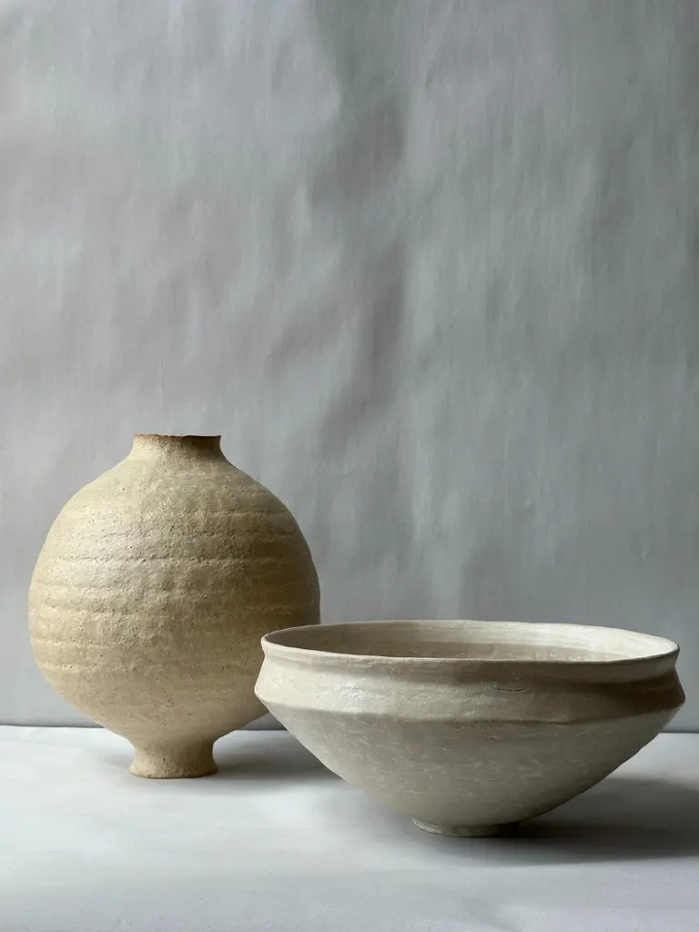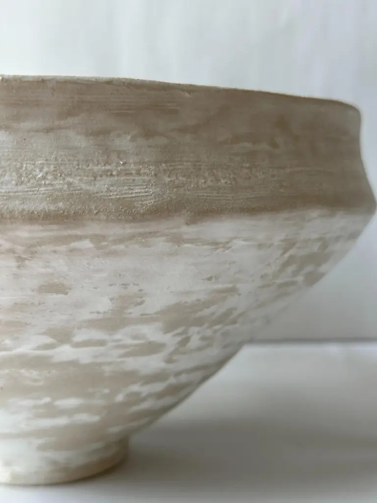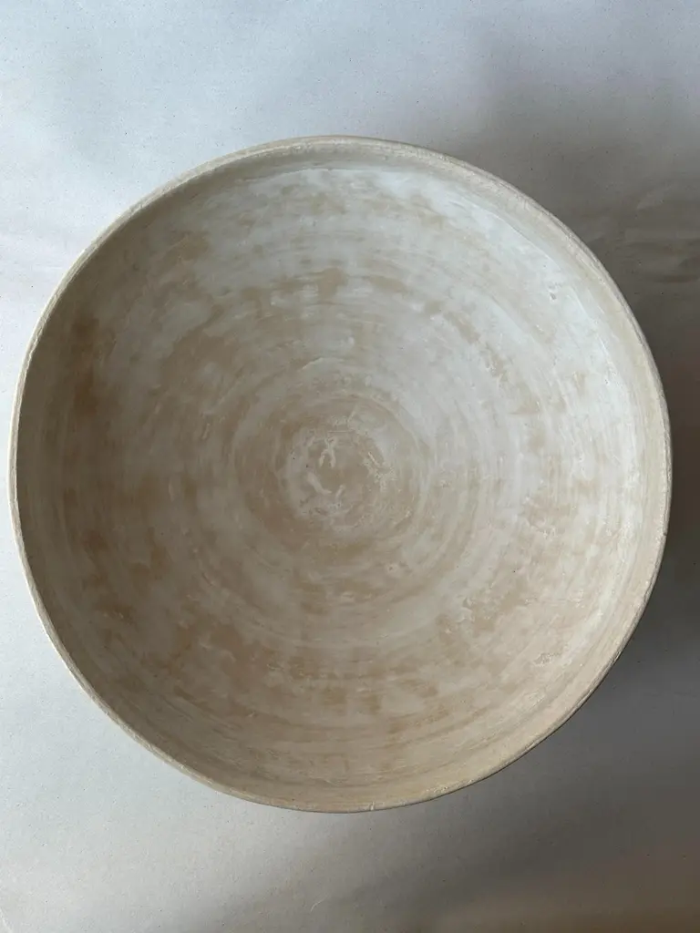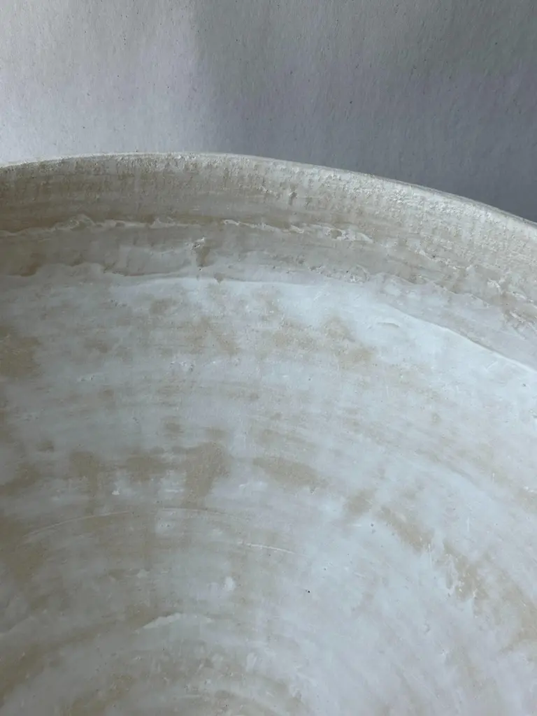 Grey Stoneware Roman Bowl by Elena VasilantonakiUniqueDimensions: ⌀ 28 x H 14 cm (Dimensions may vary)Materials: StonewareAvailable finishes: Black, White, Brown, Red White PatinaGrowing up in Greece I was surrounded by pottery forms that have changed little since the ancient times. Inspired by the various forms of those early vessels, I create works with an ancient feel and a minimalistic aesthetic, incorporating the principle of Japanese aesthetics of wabi sabi.The pieces are built entirely by hand with the coiling technique, in a variety of stoneware clays, red, black, white, brown, brushed with terra sigillata and\or experimental glazes and textured surface, resulting in slight variations with each piece.No watertight. Made in Athens, Greece.
