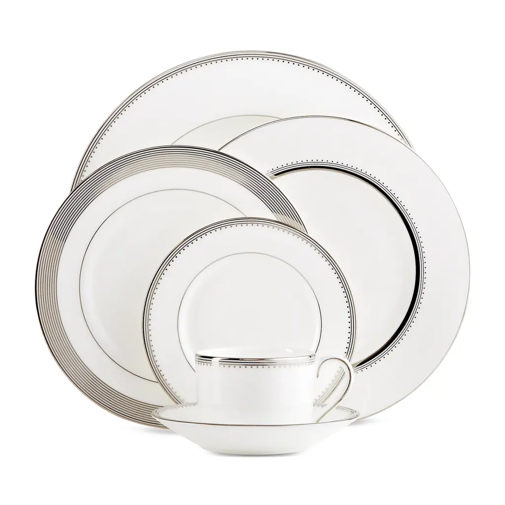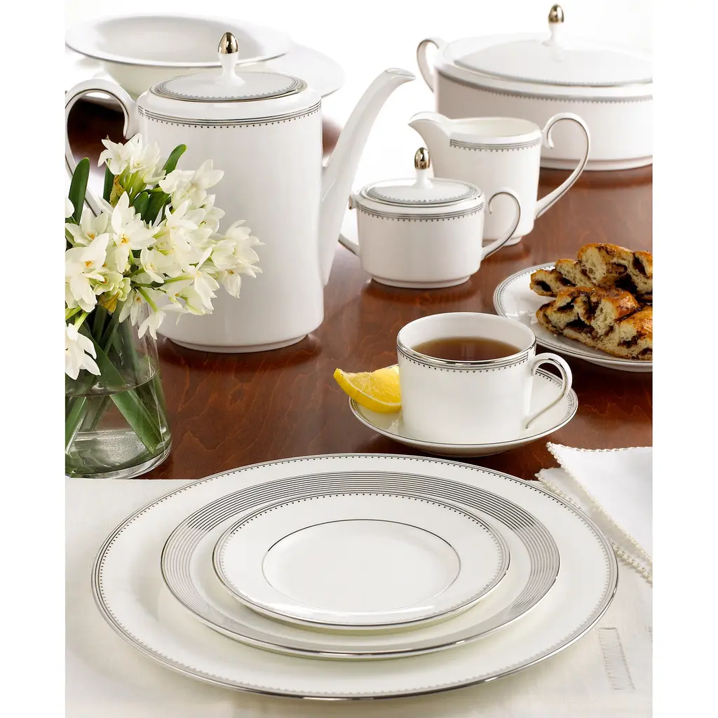 A beautiful collection for formal dining in white fine bone china with delicate platinum-hued rim accents.