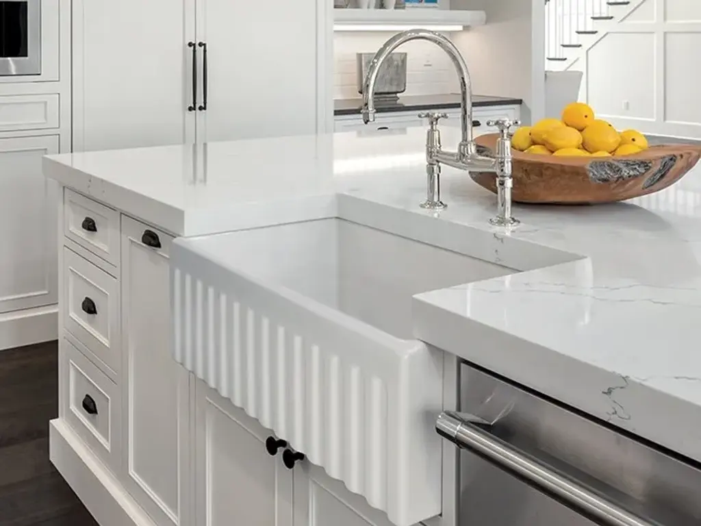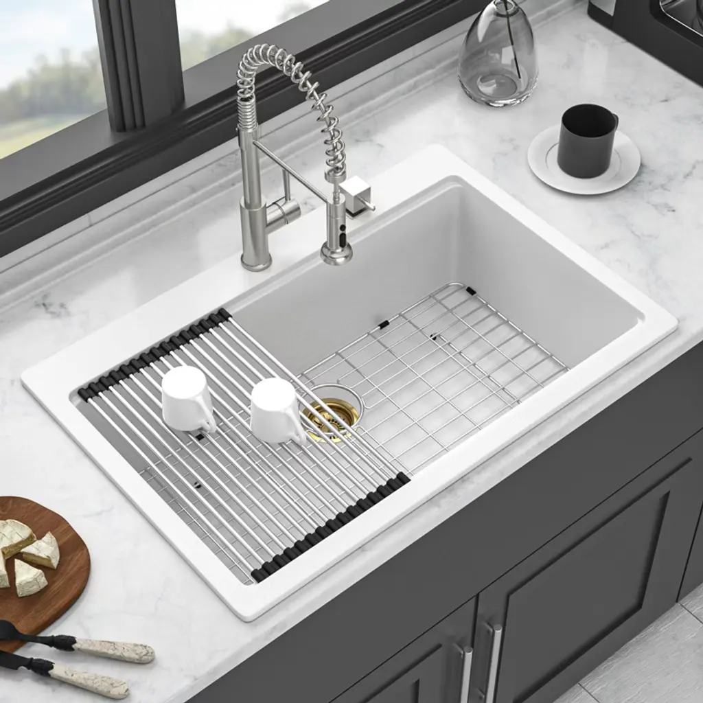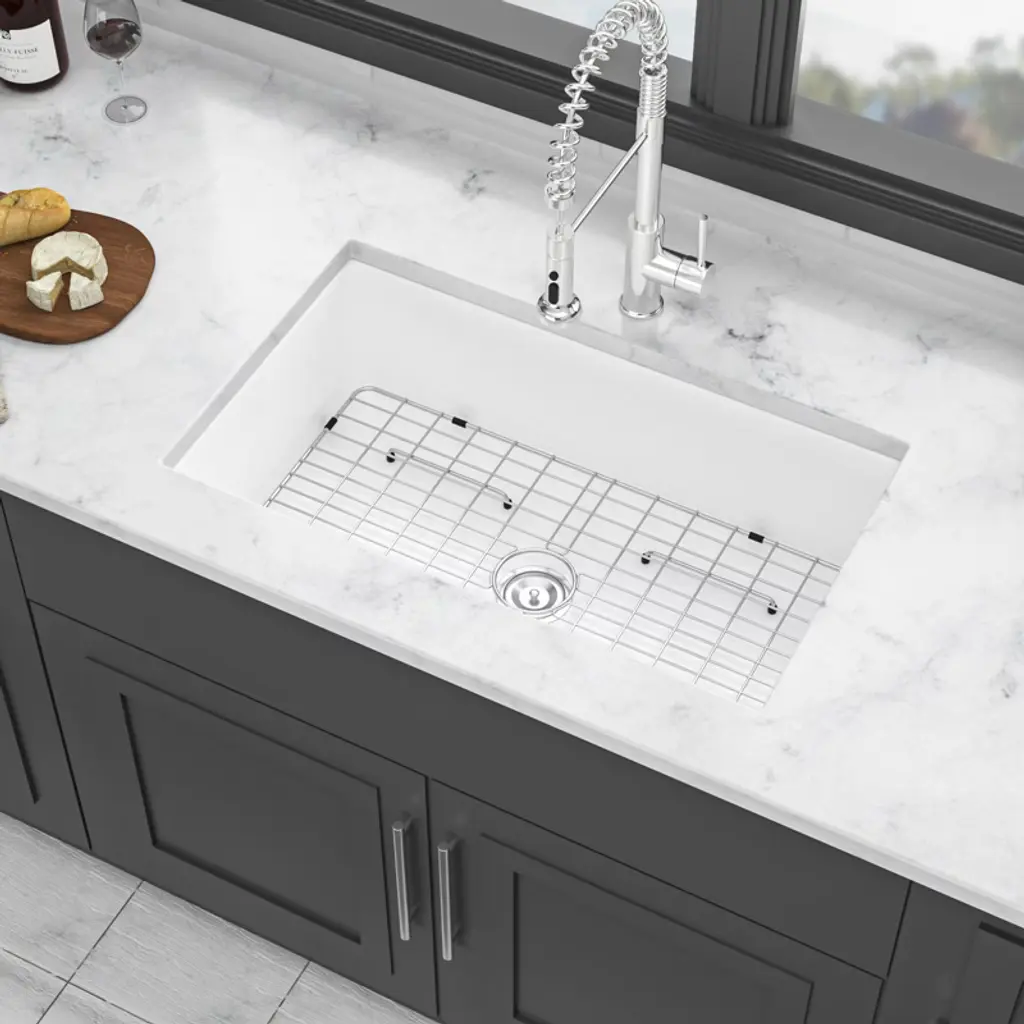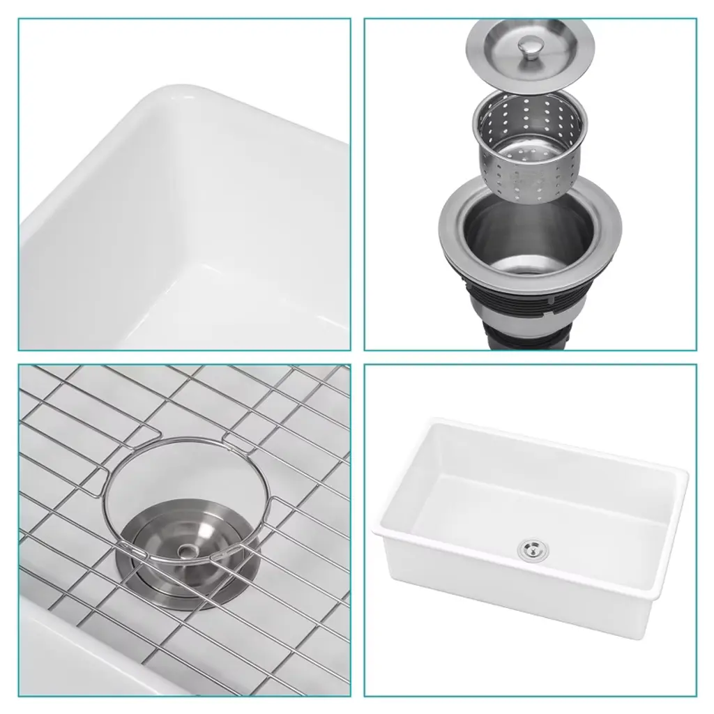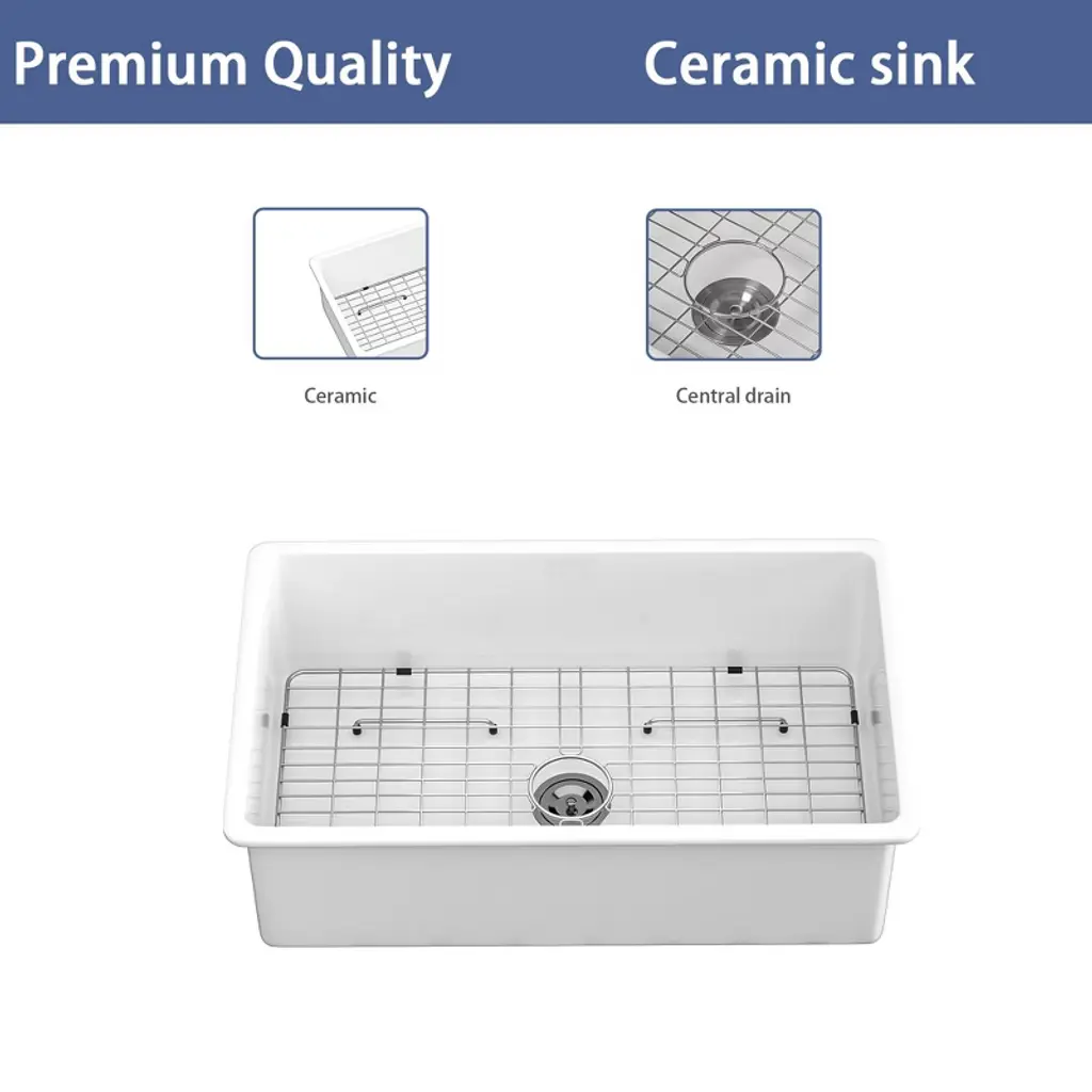 Gulches 32" white ceramic single bowl sink offers dual installation¡ªundermount (seamless with countertops, easy to clean) or top mount (simple setup). Crafted from durable ceramic, it resists heat, chips, and stains. Deep 10" basin fits large cookware. Easy to clean with soapy water. Includes dish grid and basket strainer.