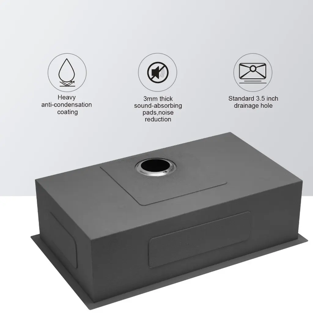Gulches 33" undermount sink, crafted from 16-gauge food-grade 304 stainless steel, offers durability and easy cleaning. X-shaped water guide ensures smooth drainage. Thick coating prevents condensation; 3mm silencer pads reduce noise. Includes drain assembly, clips, template, and instructions. Fits 36" cabinets.