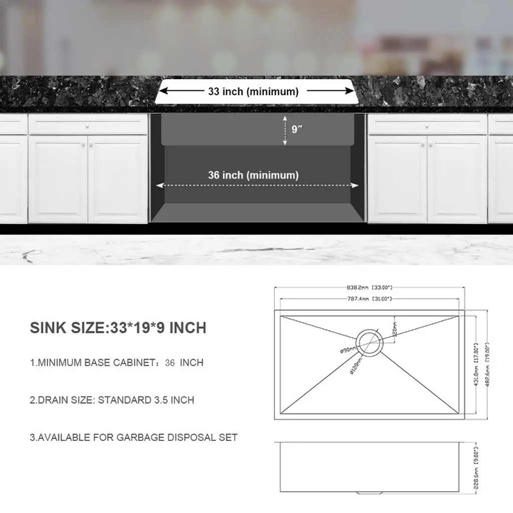 Gulches 33"x19"x9" Undermount Single Bowl Kitchen Sink, 16 Gauge 304 Stainless Steel, Includes Drain Assembly