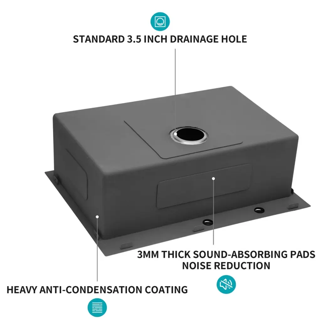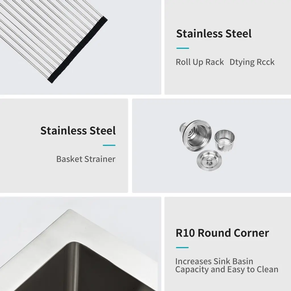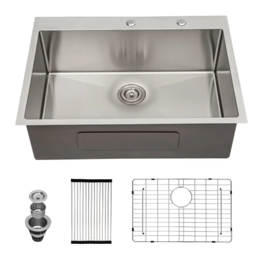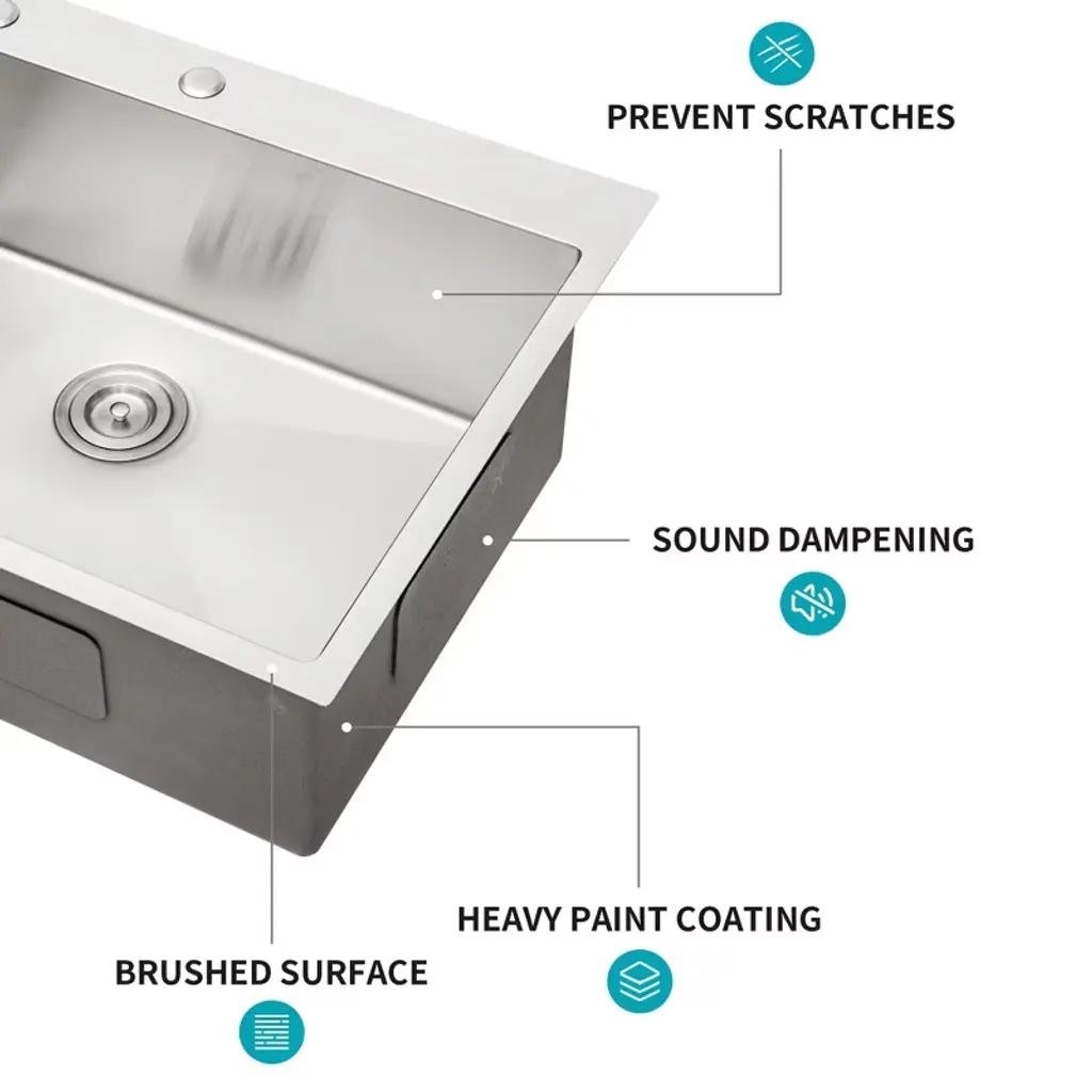 Gulches 33"x22" drop-in sink, crafted from 16-gauge T304 stainless steel (1.5mm thick), resists deformation even with heavy use. R10 round corners prevent rust and ease cleaning. X-shaped guide ensures smooth drainage. Thick coating stops condensation; 3mm pads reduce noise. Includes dish grid, drain, and installation tools. Fits 36" cabinets.