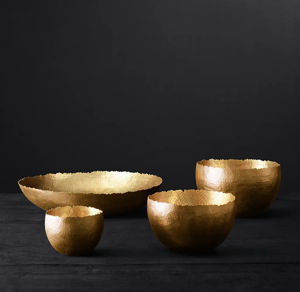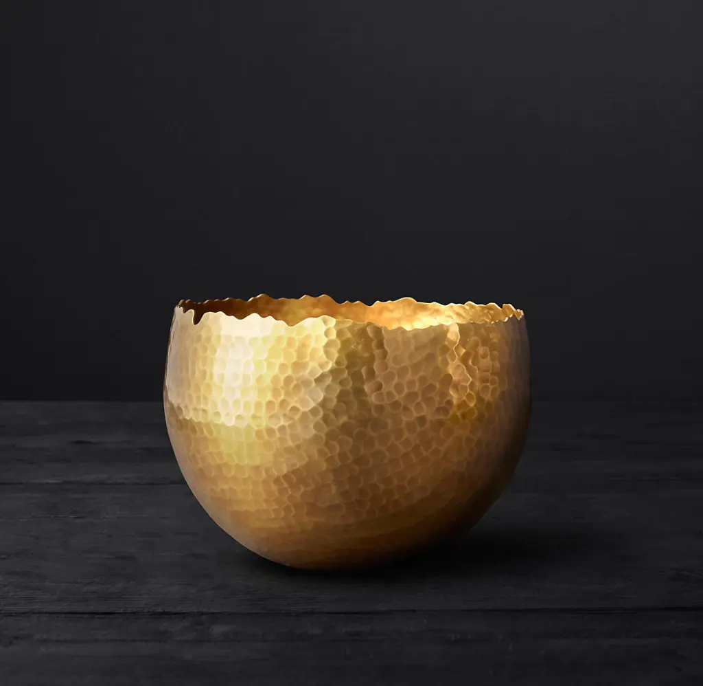Our burnished brass bowl pairs a textured, hand-hammered facade with a tactile, irregular edge, displaying the mark of the artisan's hand.