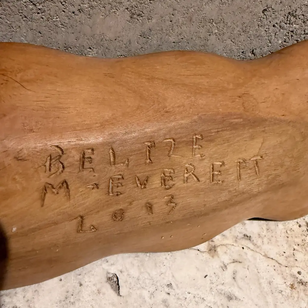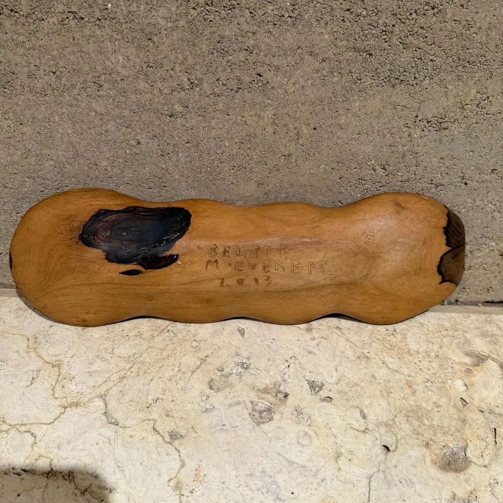 For your consideration , a handcarved wood bowl by M Everett. Made in Belize, 2013. Modern design. Unsure of name of the wood, It has maple and rosewood grain. Carved of a single piece wood. Signed at the bottom.Dimensions:1.75 H x 4.75 D x 15.75 WPlease visit take a look at our listings, we have an amazing curated collection of hard to find items.
