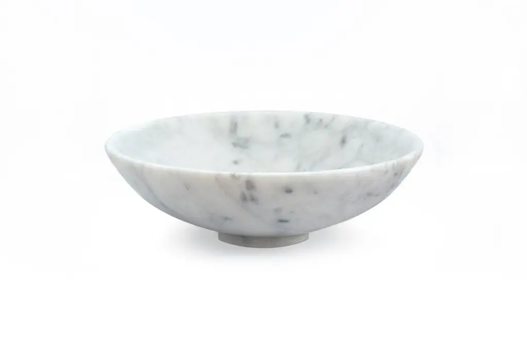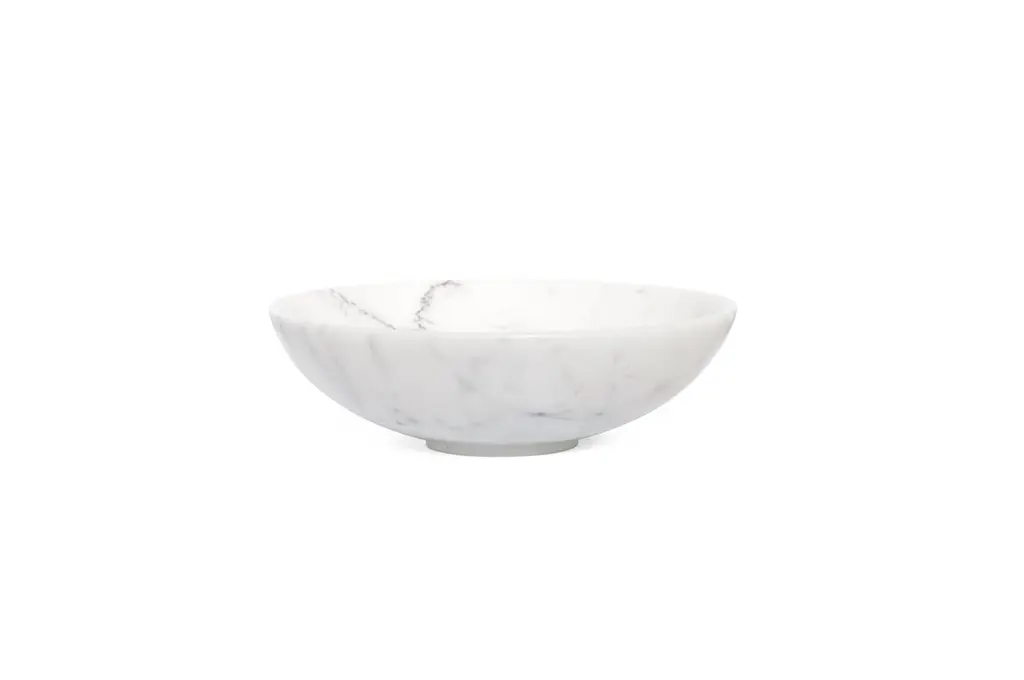 Fruit bowl in white Carrara marble. processed in Carrara, Italy. you have a 100% made in Italy product.it is ideal to present fruit or to be used as a centrepiece.Each piece is in a way unique (every marble block is different in veins and shades) and handmade by Italian artisans specialized over generations in processing marble. Slight variations in shape, color and size are to be considered a guarantee of an handmade creation.Important: Do not use lemon or vinegar on it, clean only with water and natural soap (like Marseilles soap), do not put in dishwasher. Measures: Diameter 30cm.