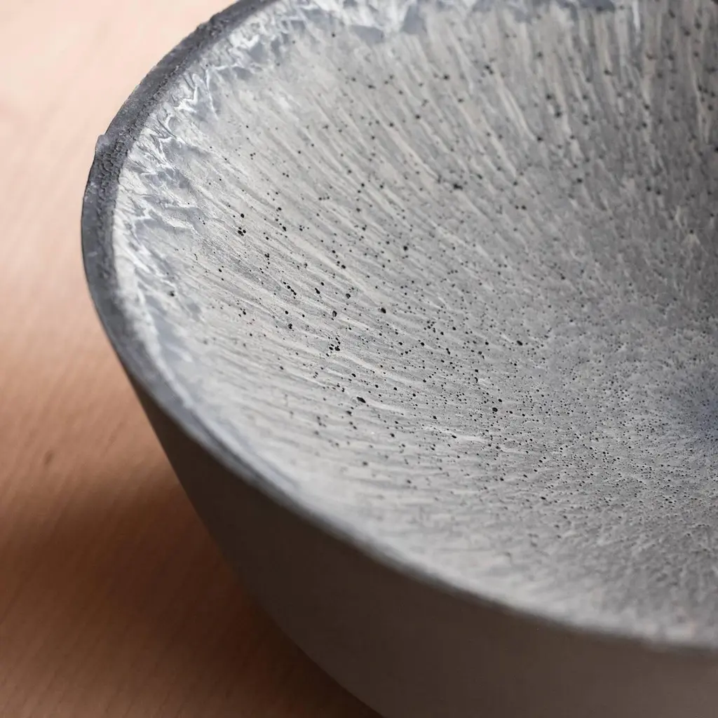 A collection of 236 unique bowls, the Concrete series by UMÉ Studio expresses the tension between heavy concrete and its delicate edge generated by hand pouring. While one assumes concrete should be strong and durable, it is, at its core, fragile. This duality invites touch and contemplation, making it the perfect vessel for daily inspiration and display. Each cast is a unique piece, handmade, and one of a kind.Bowl 232Measures: 5-11"; round3-7"; tall2-4 lbsBlack / Charcoal / AshCast concrete / Gypsum cement / Mica and natural pigments.Items are inherently fragile and should be handled with care, kept away from liquids. Bowls are not food safe.Pieces can be made to order if ordering in quantities of six or moreSize: Between 3 inch (7cm) diameter - 13 inch (33cm) diameterColor: White speckle, grey speckle and black.