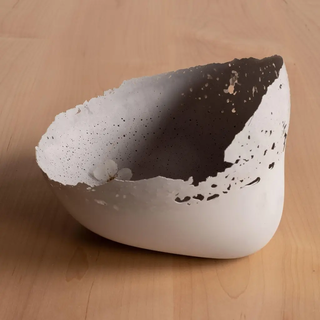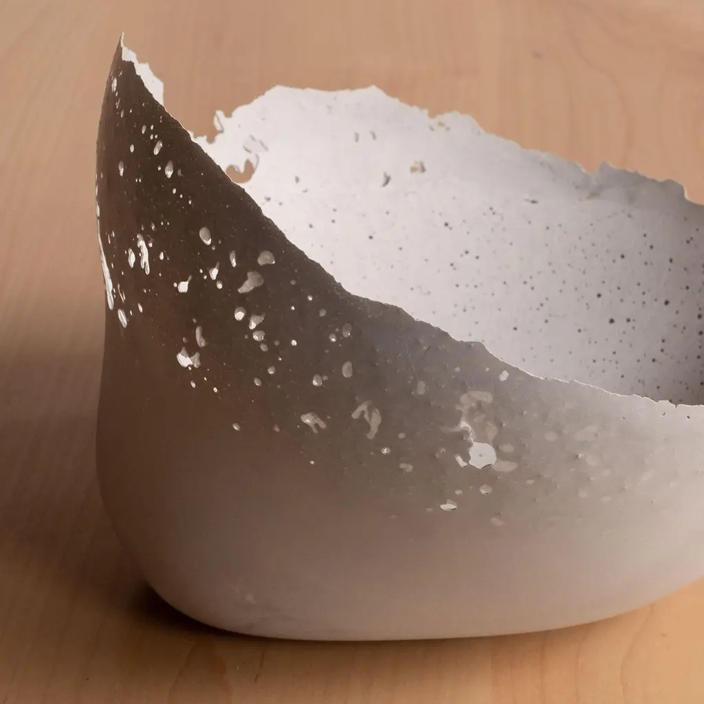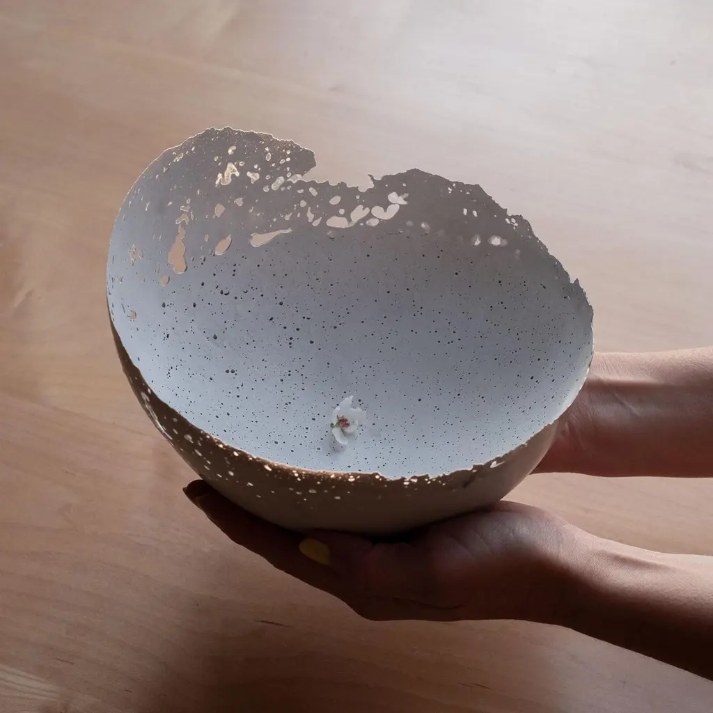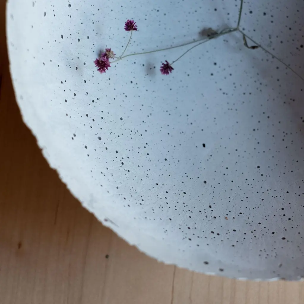 An edition of 150 unique bowls, the concrete Series by UMÉ Studio expresses the tension between heavy concrete and its delicate edge generated by hand pouring. While one assumes concrete should be strong and durable, it is, at its core, fragile. This duality invites touch and contemplation, making it the perfect vessel for daily inspiration and display. Each cast is a unique piece, handmade and one of a kind. Bowl 474GreyCast concrete / Gypsum cement / Mica and natural pigments Items are inherently fragile and should be handled with care, kept away from liquids. Bowls are not food safe.Pieces can be customized if ordered in quantities of six or moreSize: Diameter between 3 inches (7cm) - 13 inches (33cm)Height: Between 3 inches (7cm) - 8 inches (20cm)Color: White speckle, grey speckle, black.