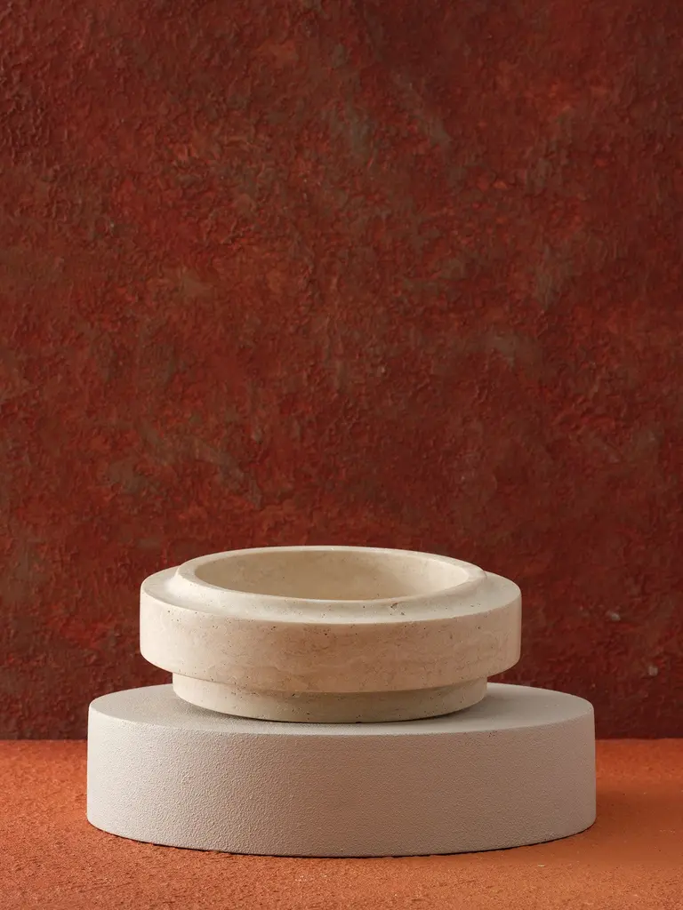 With its bold geometry and monolithic form, the Tıklı Çanak is a refined expression of timeless craftsmanship. Handmade from solid travertine, this sculptural bowl features a low, wide silhouette elevated on a subtle pedestal base, creating an architectural interplay of shape and shadow. The smooth, honed surface highlights the natural veining and tone variations of the stone, giving each piece a uniquely grounded character. Ideal for display on coffee tables, consoles, or entryway surfaces, this statement object brings minimal sophistication and textural warmth to any interior.