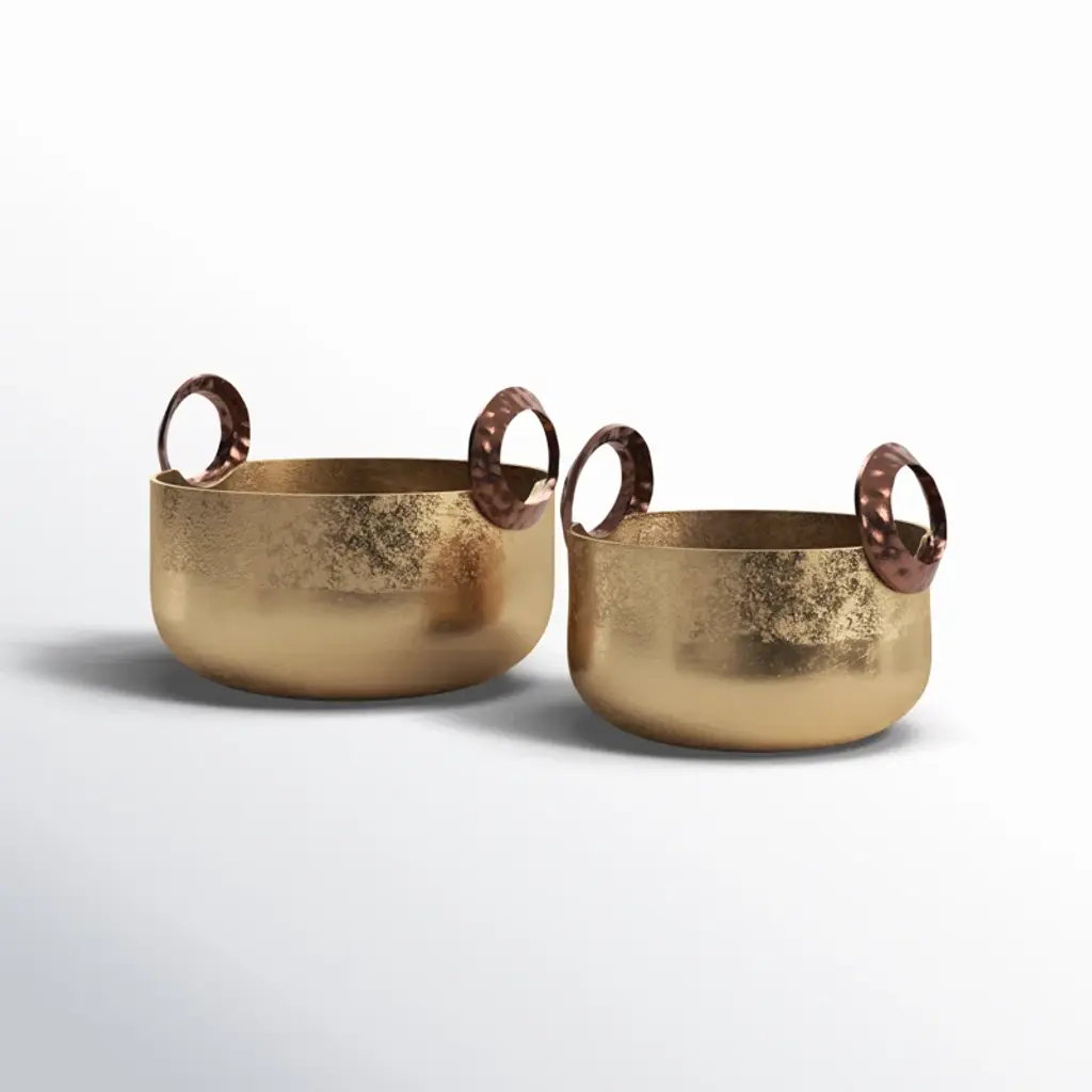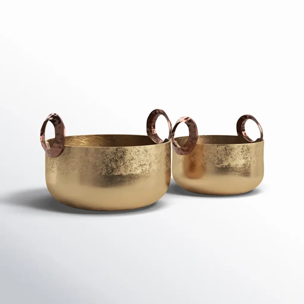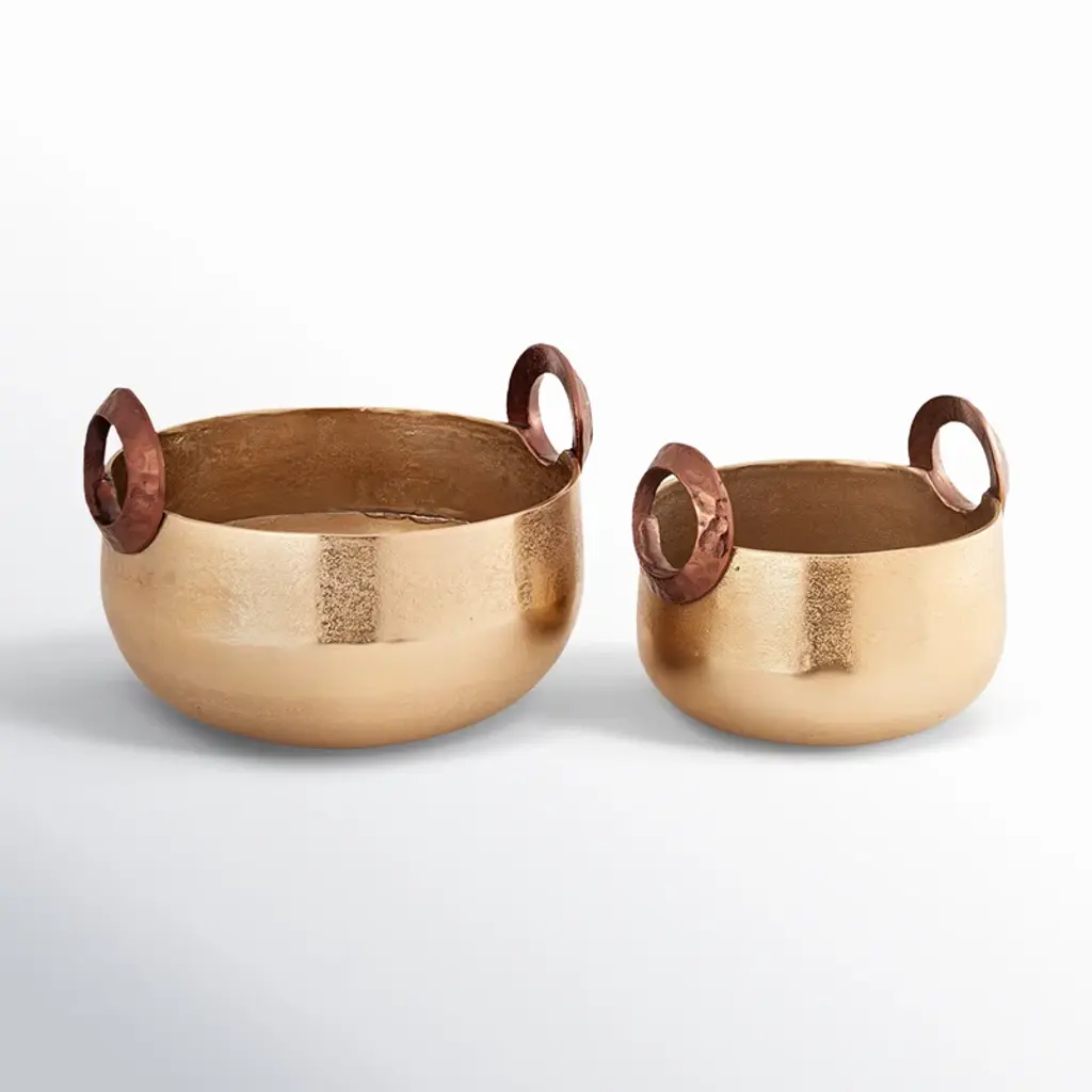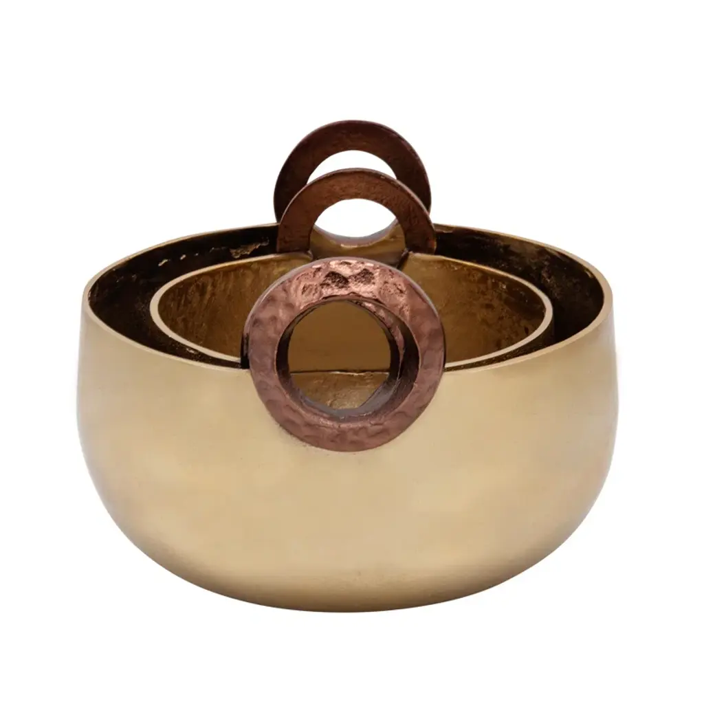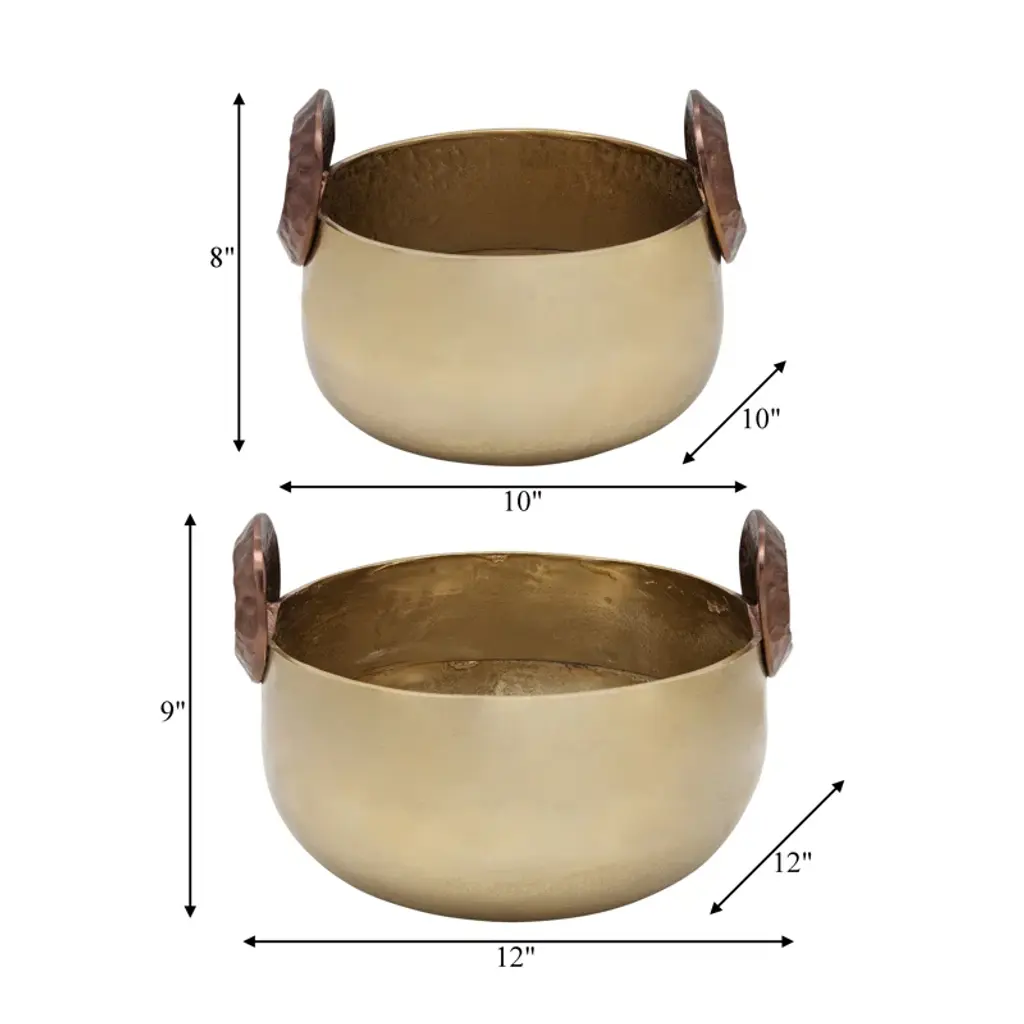 Time for a style overhaul? Look no further! This set of 2 gold metal bowls will add the perfect decorative touch to your home, while also giving a chance for creative and stylish storage. Created out of high quality aluminum and stainless steel, this 2-piece set includes two different sizes of trendy bowls in a gold coloring with bronze handles. A perfect addition to your kitchen, these bowls fit the part in both functionality and aesthetic. Use your imagination to go beyond the kitchen to use anywhere you could use some added color and style. You can’t go wrong!