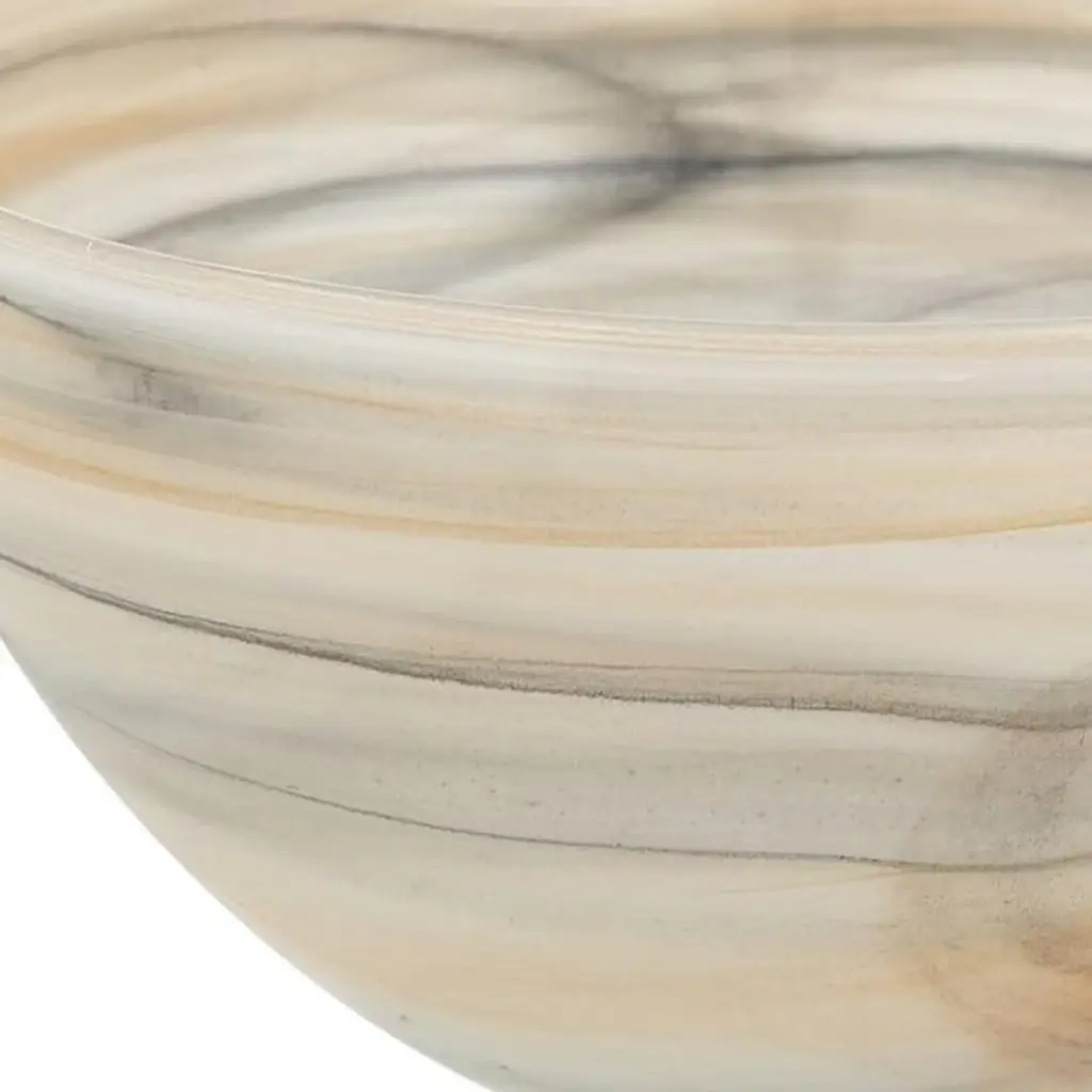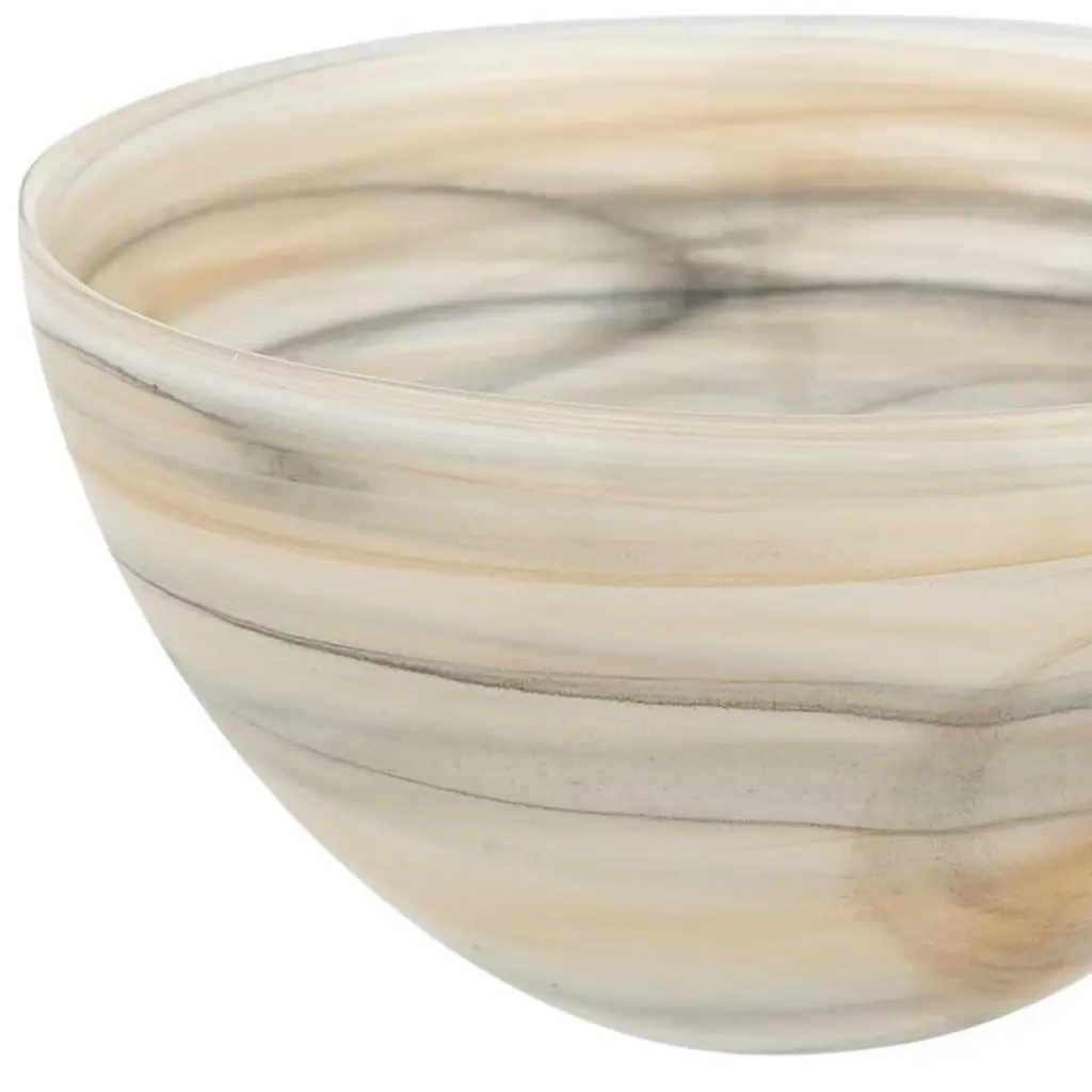 The 6-inch taupe and white alabaster glass round candy or nut bowl is a sophisticated addition to your tableware collection. European handcrafted from high-quality alabaster glass, this bowl showcases exceptional artistry and attention to detail. Designed in a soft round shape, it will enhance the presentation of whatever you choose to fill it with; or create a striking decorative display on its own. Enjoy the perfect blend of art and practicality with this charming all-purpose bowl. Elevate your dining experience with this elegant serving bowl that beautifully combines functionality and style. 2.5-inch h x 6-inch w x 6-inch d.