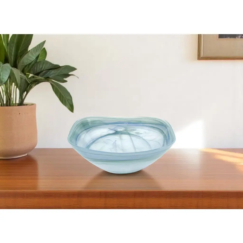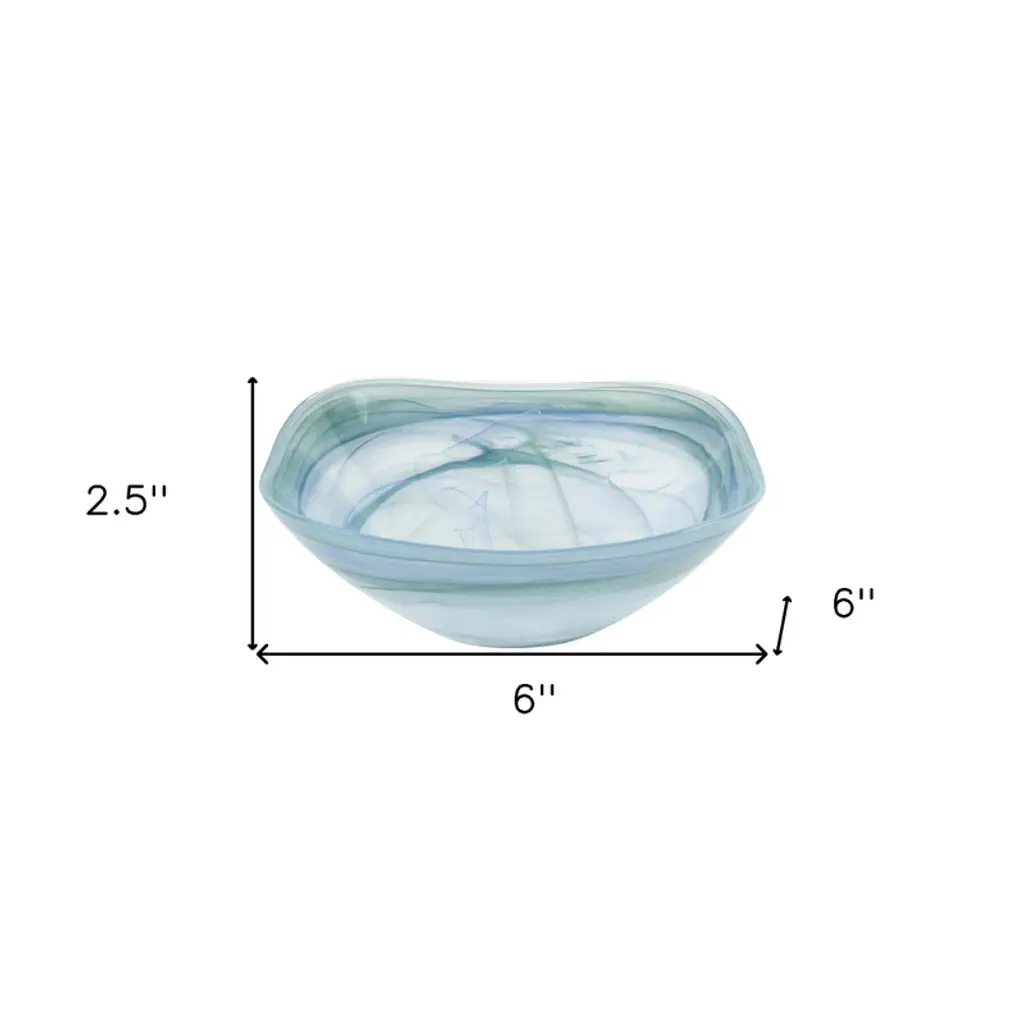 This 6-inch aqua blue and white alabaster glass square candy or nut bowl set of two is a chic addition to any space. European hand-crafted from high-quality alabaster glass, this serving bowl showcases an eye-catching blend of calming coastal hues. Its modern soft square shape perfectly complements contemporary decor styles, making it ideal for everyday and special occasions. 2.5-inch h x 6-inch w x 6-inch d.