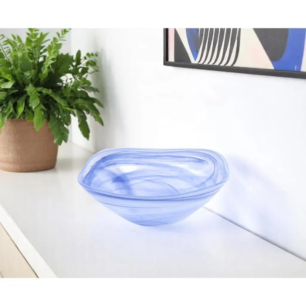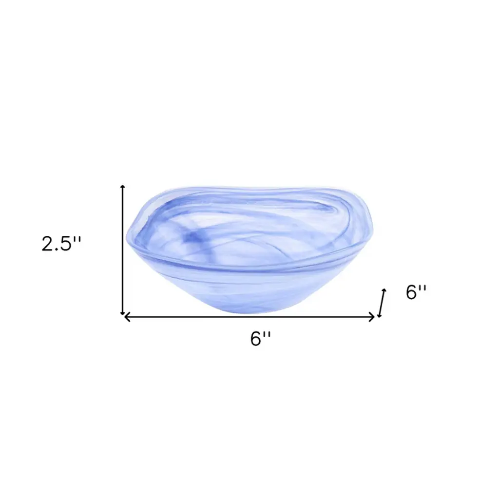 Set of two 6-inch blue and white alabaster glass square candy or nut bowls offer a stylish addition to your tabletop. European handcrafted from high-quality alabaster glass, these bowls showcase exceptional artistry and attention to detail. Designed in a soft corner square shape, they will enhance the presentation of whatever you choose to fill them with; or create a striking decorative display on their own. Elevate your entertaining experience with this exquisite serving bowl duo. 2.5-inch h x 6-inch w x 6-inch d.