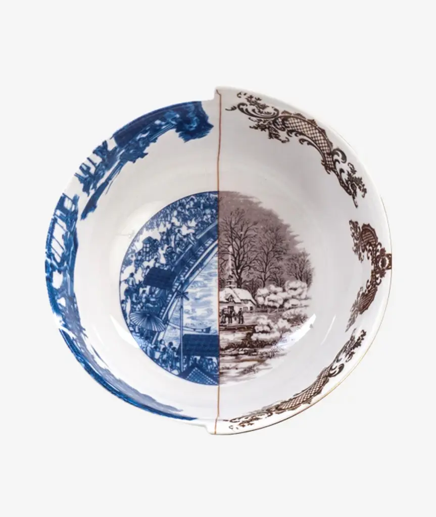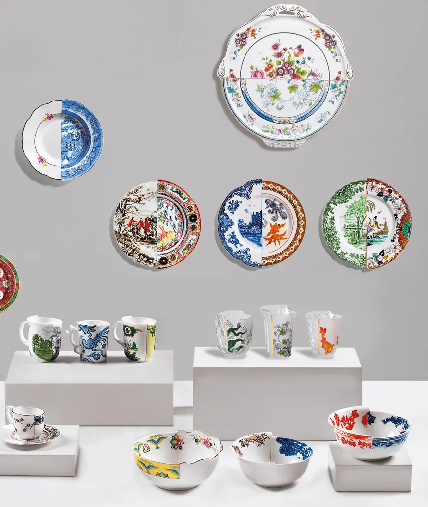 The split personality Hybrid dinnerware series fuses traditional Eastern and Western aesthetics in a playful but sophisticated way. Each piece of the collection melds two different china patterns – one from the East and one from the West – giving the impression that two separate plates, bowls, or cups have been joined together. To see the entire Hybrid dinnerware series, click here.