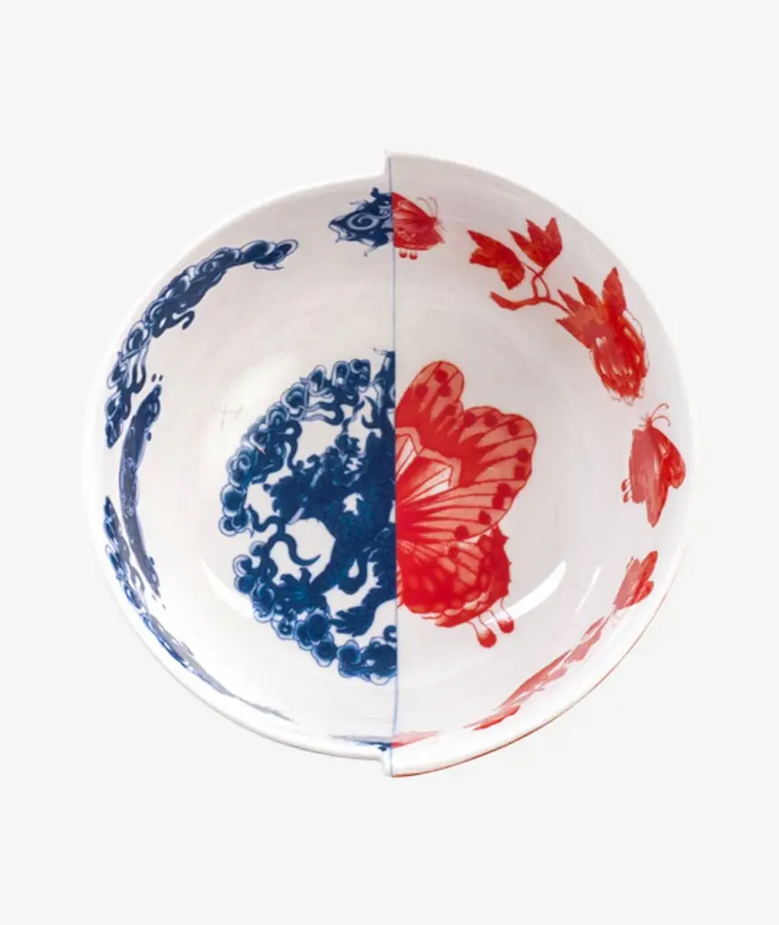 The split personality Hybrid dinnerware series fuses traditional Eastern and Western aesthetics in a playful but sophisticated way. Each piece of the collection melds two different china patterns – one from the East and one from the West – giving the impression that two separate plates, bowls, or cups have been joined together. To see the entire Hybrid dinnerware series, click here.