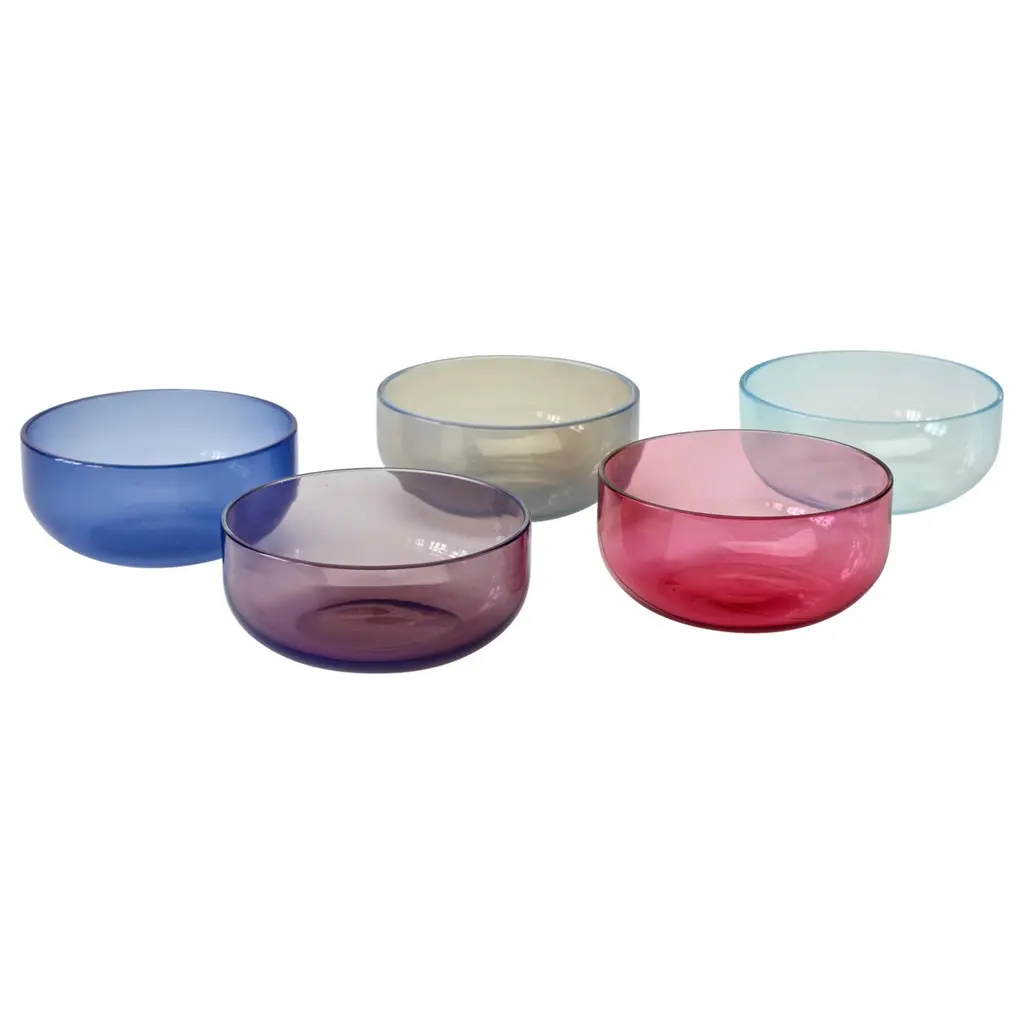 Lente, ottico, ottico torsé, balloton, rigadin, and torsé are the traditional Muranese textures characterizing this precious assorted set of six mouth-blown Murano glass bowls. Offered in a sophisticated and delicate purple tone, the set stands out for its subtle dynamism that can be either appreciated with a simple glance or gesture. More colors are available in the Artemest catalog.
