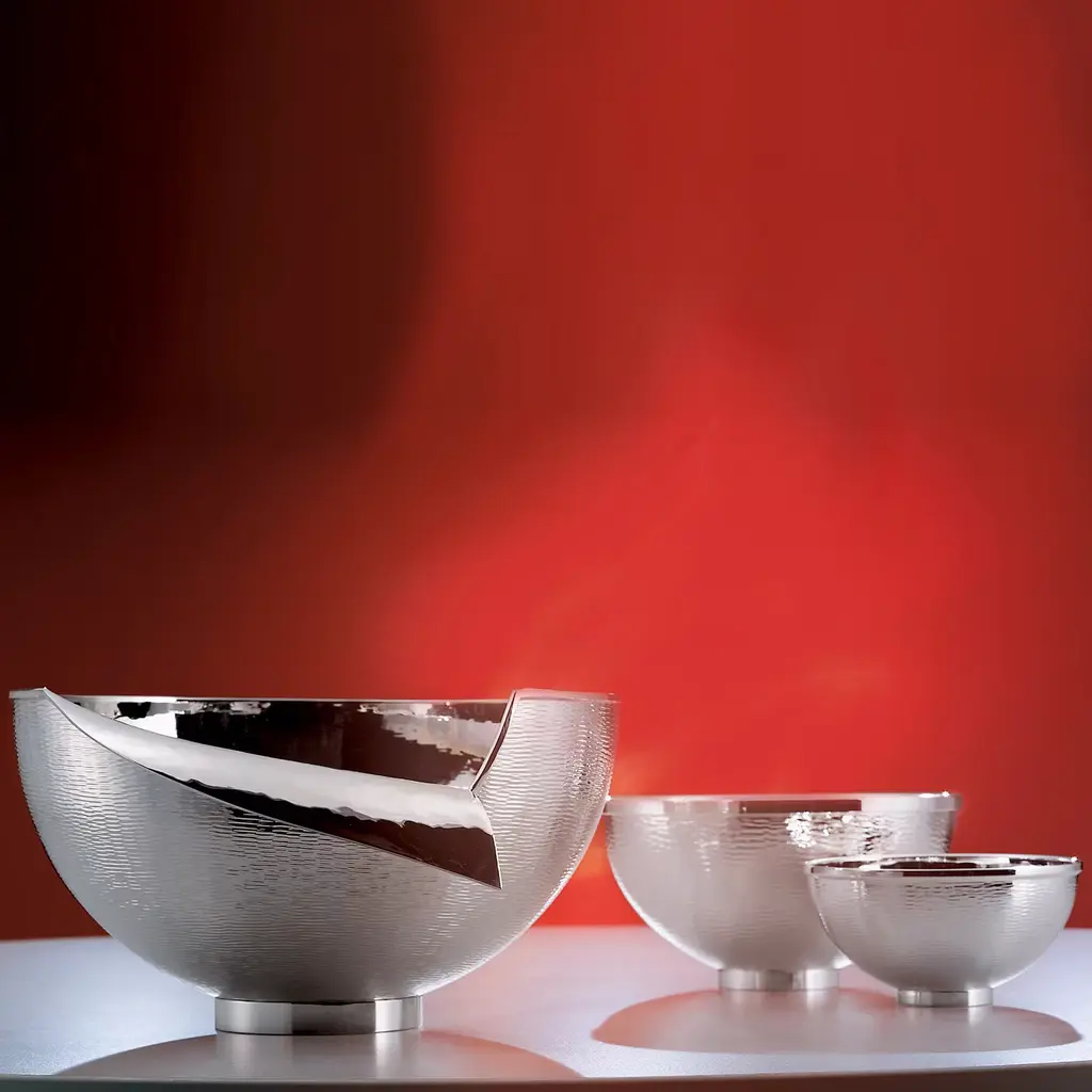 Centerpiece expertly constructed in a silver-plated alloy. This elegant and refined large bowl has a texture on the outside which complements the polished and hammered interior. Also available in brass finish .