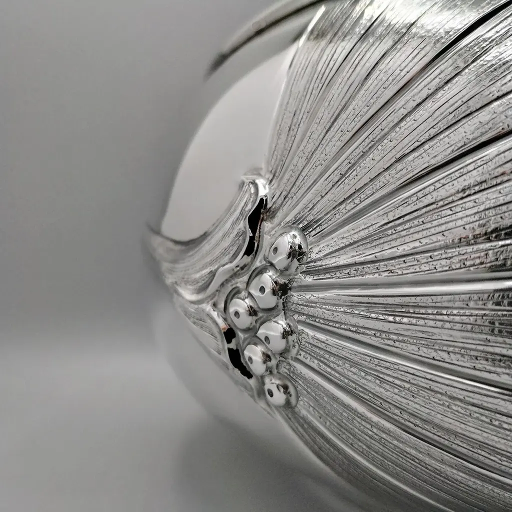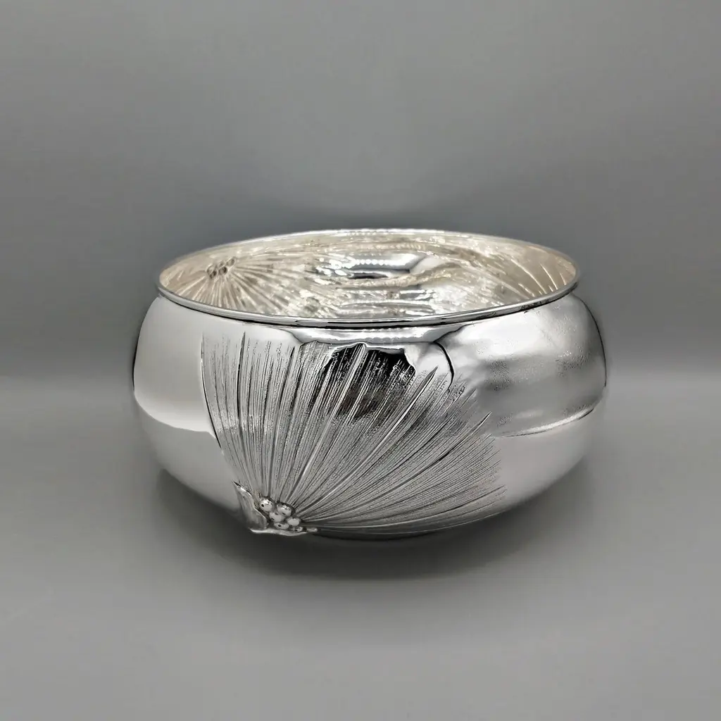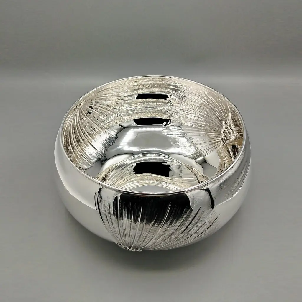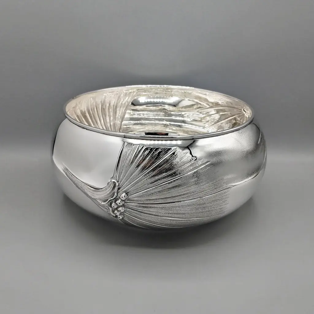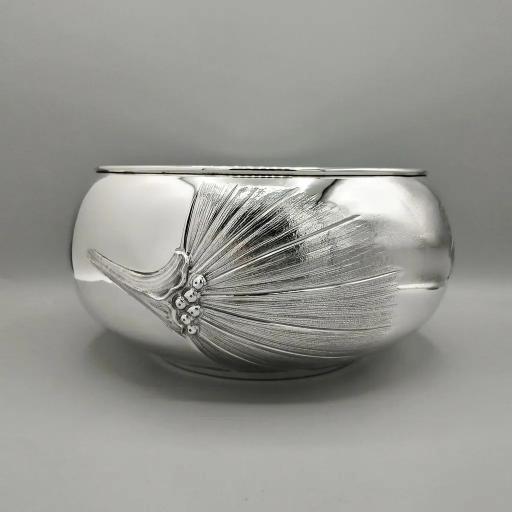 800 silver bowl embossed and chiseled with Strelitzia Flowers.The body of the bowl is round and very rounded where 3 symmetrical strelitzia flowers have been embossed and engraved, different from each other.This embossing was done with extreme precision giving the flower naturalness and proportion.Visible inside the bowl, the embossing is very pleasant and elegant even if seen in "negative."This bowl, being of very simple design, can be placed on any type of furniture without changing the balance of elegance and style.Made in Milan - Italy - in the silversmith's workshop of Virginio Cesani for ARVAL ARGENTI VALENZA