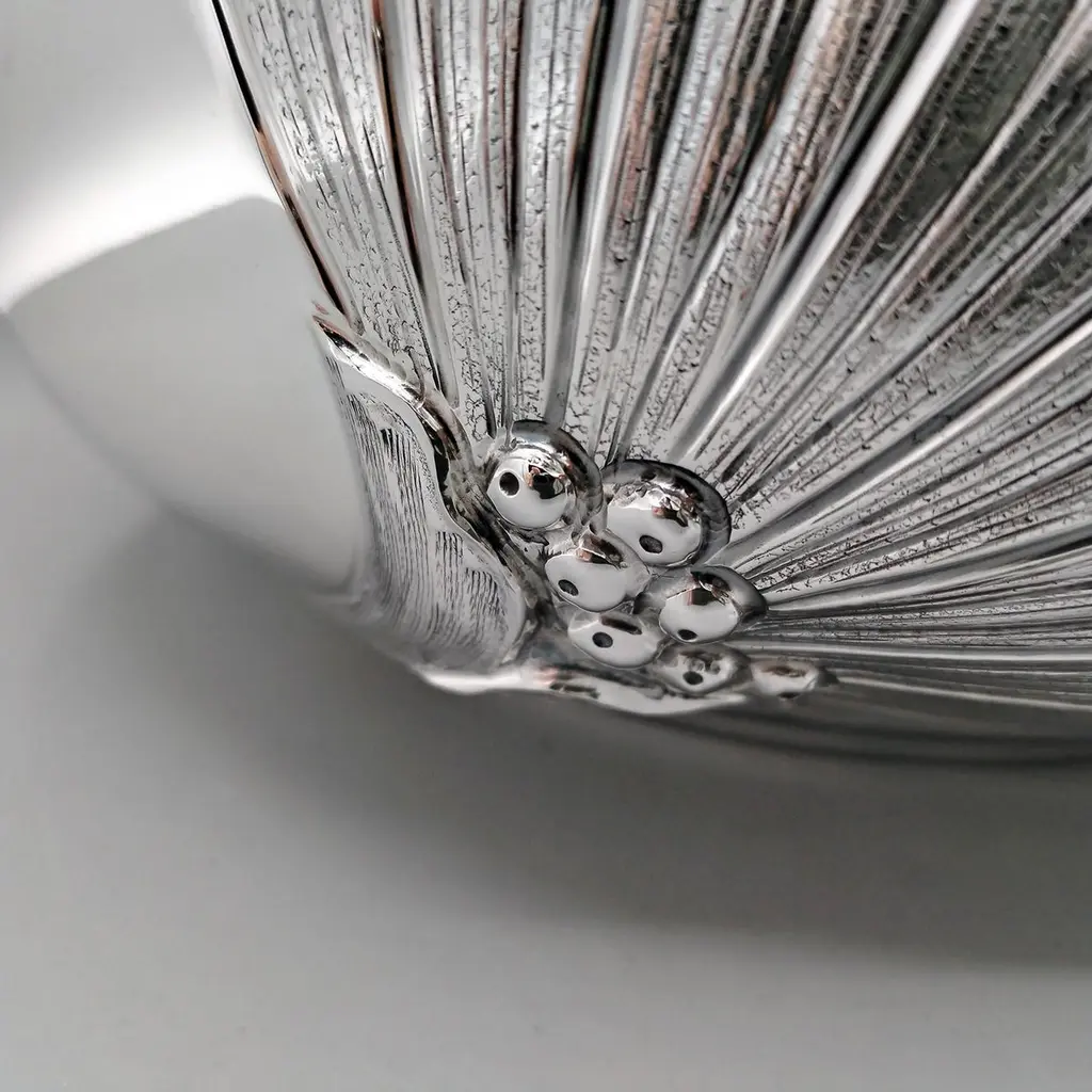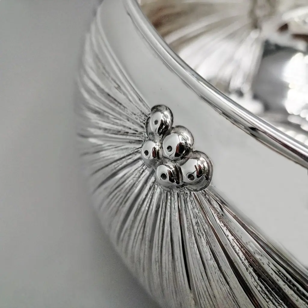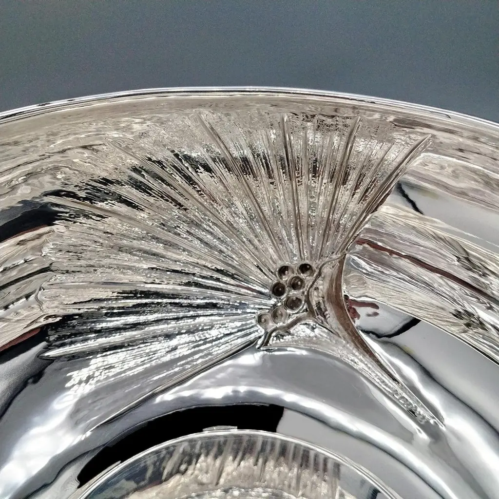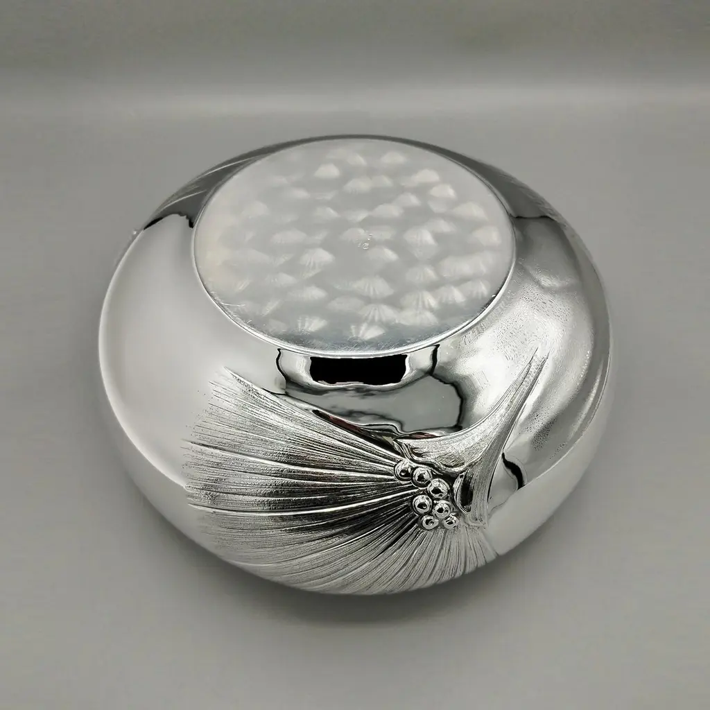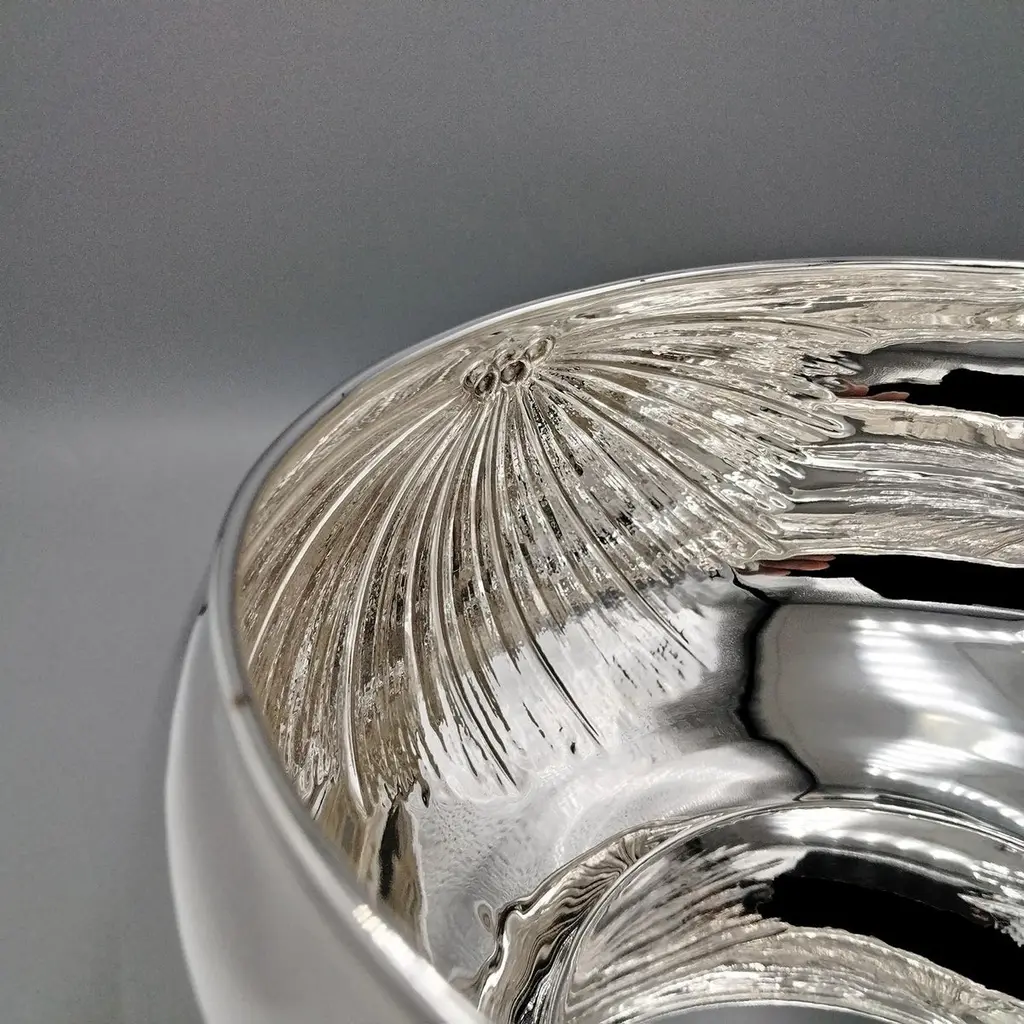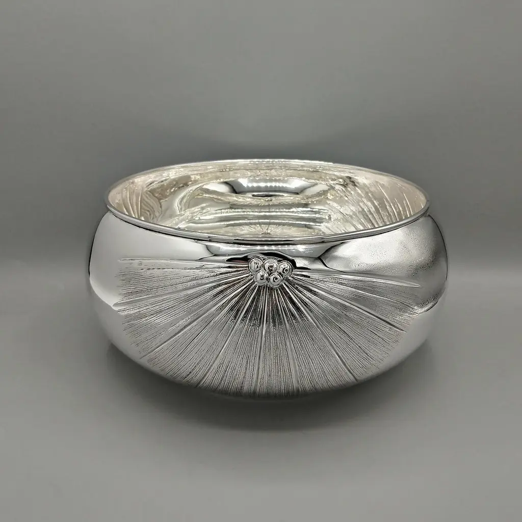 800 silver bowl embossed and chiseled with Strelitzia Flowers.The body of the bowl is round and very rounded where 3 symmetrical strelitzia flowers have been embossed and engraved, different from each other.This embossing was done with extreme precision giving the flower naturalness and proportion.Visible inside the bowl, the embossing is very pleasant and elegant even if seen in "negative."This bowl, being of very simple design, can be placed on any type of furniture without changing the balance of elegance and style.Made in Milan - Italy - in the silversmith's workshop of Virginio Cesani for ARVAL ARGENTI VALENZA