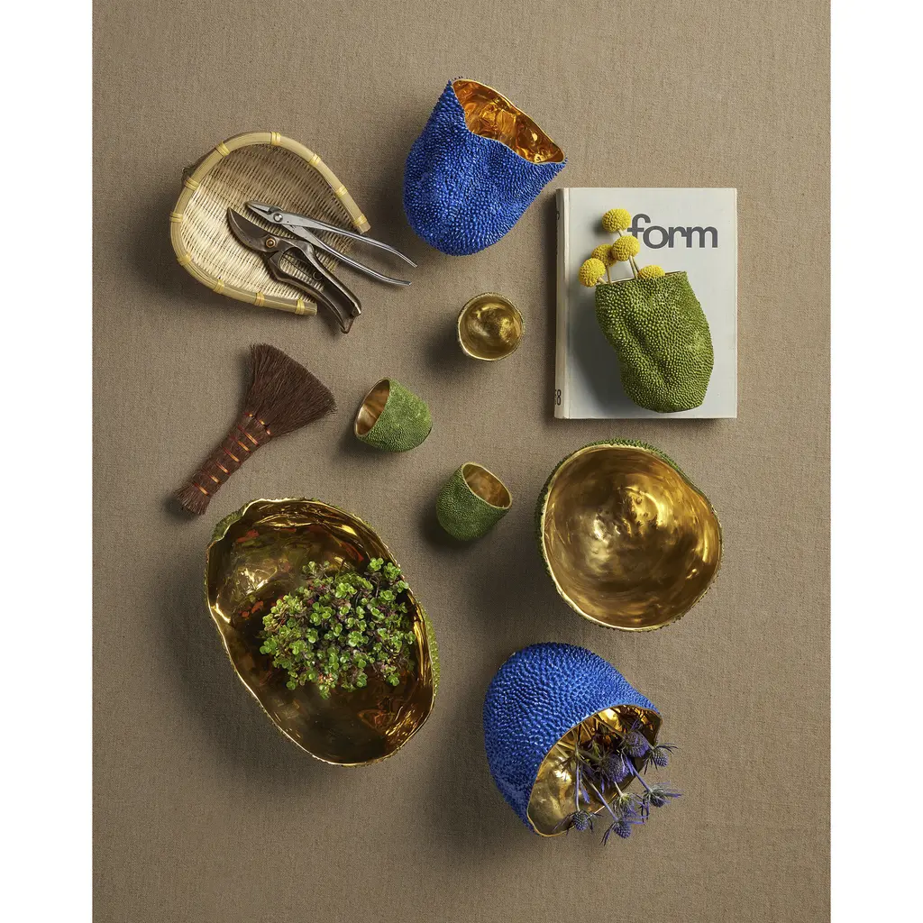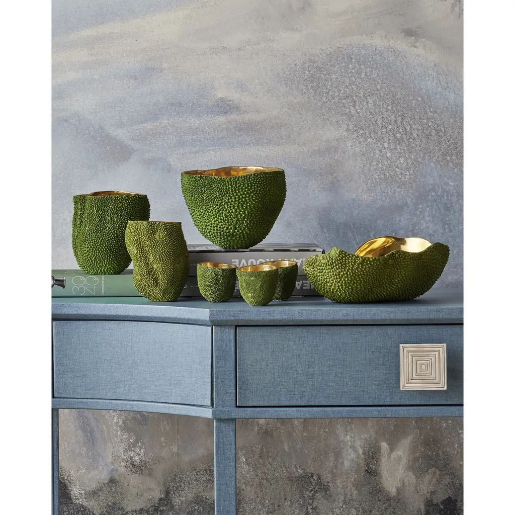 The Jackfruit decorative vessels include the Jackfruit Green Oval Bowl that is made from a lost-wax process so it reads as if it is covered in the skin of the jackfruit. The inside of each bronze bowl is a brilliant gold made of polished solid bronze, which will need to be cleaned from time to time to maintain its sheen. The green decorative vessel is water tight so it will not leak.