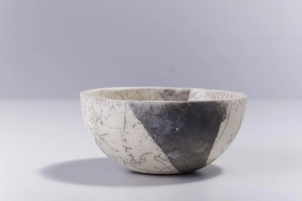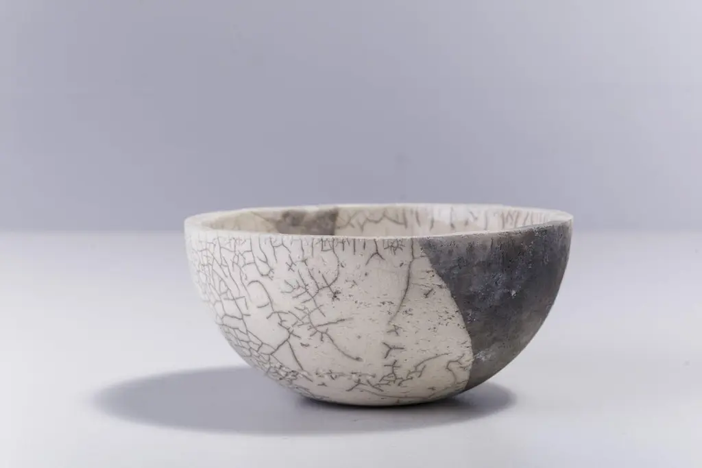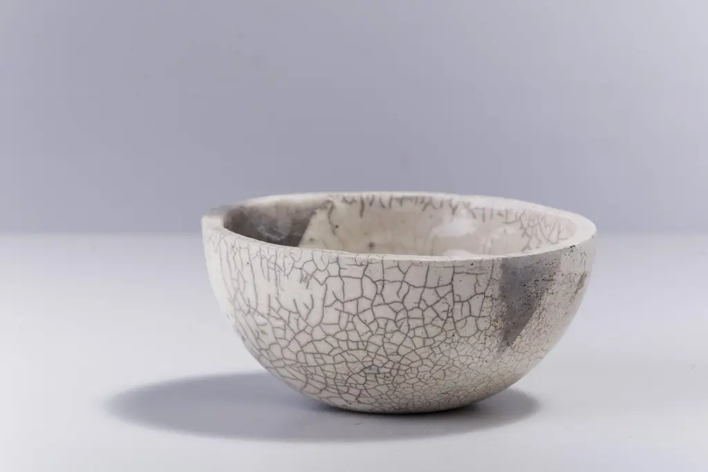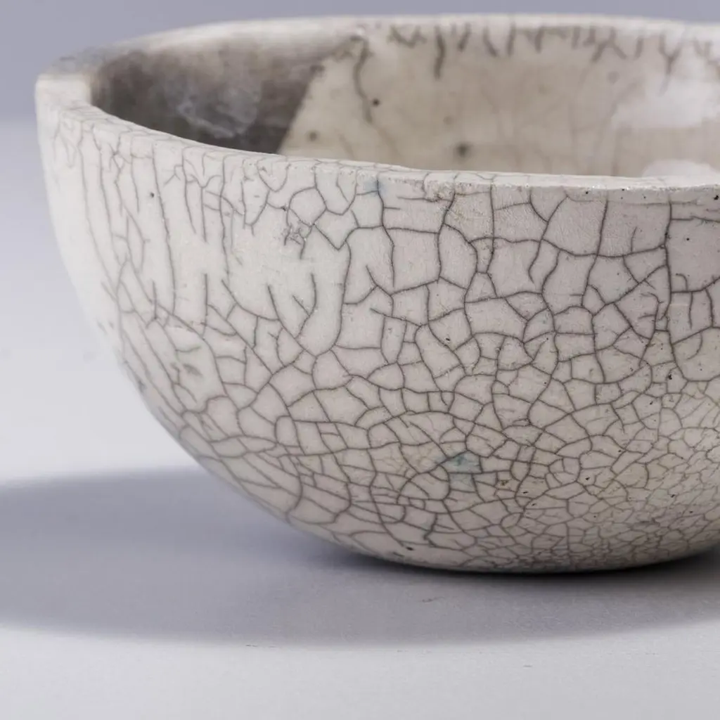 Japanese Minimalistic Laab Fringe Chawan Bowl Raku Ceramics Crackle White
