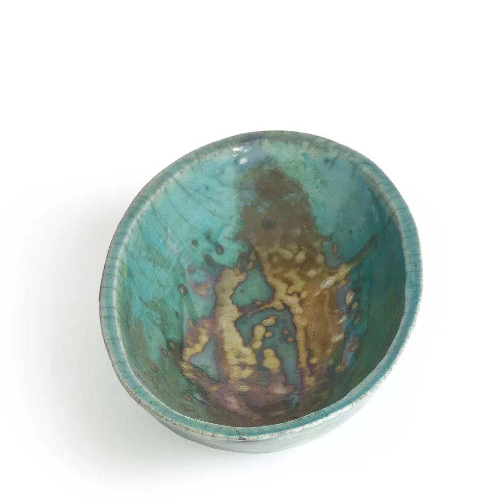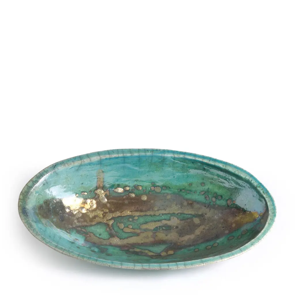 Exuding a sublime and strong visual impact in its singular handcrafted design, this oval bowl is named after the internationally renowned and appreciated Japanese dish, usually abbreviated as Don. A unique, sophisticated accent piece for an elegant interior setting, it will make an exquisite gift idea for a connoisseur of Japanese art and craftsmanship. Featuring copper green metal effect and details in gold bronze. Dimensions (cm) W 31 x D 16 x H 6 Handmade in ItalyCustomization available.
